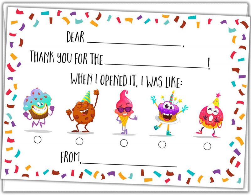 Format and style matter. This is a great time to teach your kids how to address an envelope and properly write a letter. Encourage them to write neatly and to ask you if they don’t know how to spell something. If your child is under the age of 6 and cannot write the whole note herself, you can buy the thank you cards where the child just needs to fill in the blanks. Below is an example of a nice thank you note that would be appropriate from an eight year old.