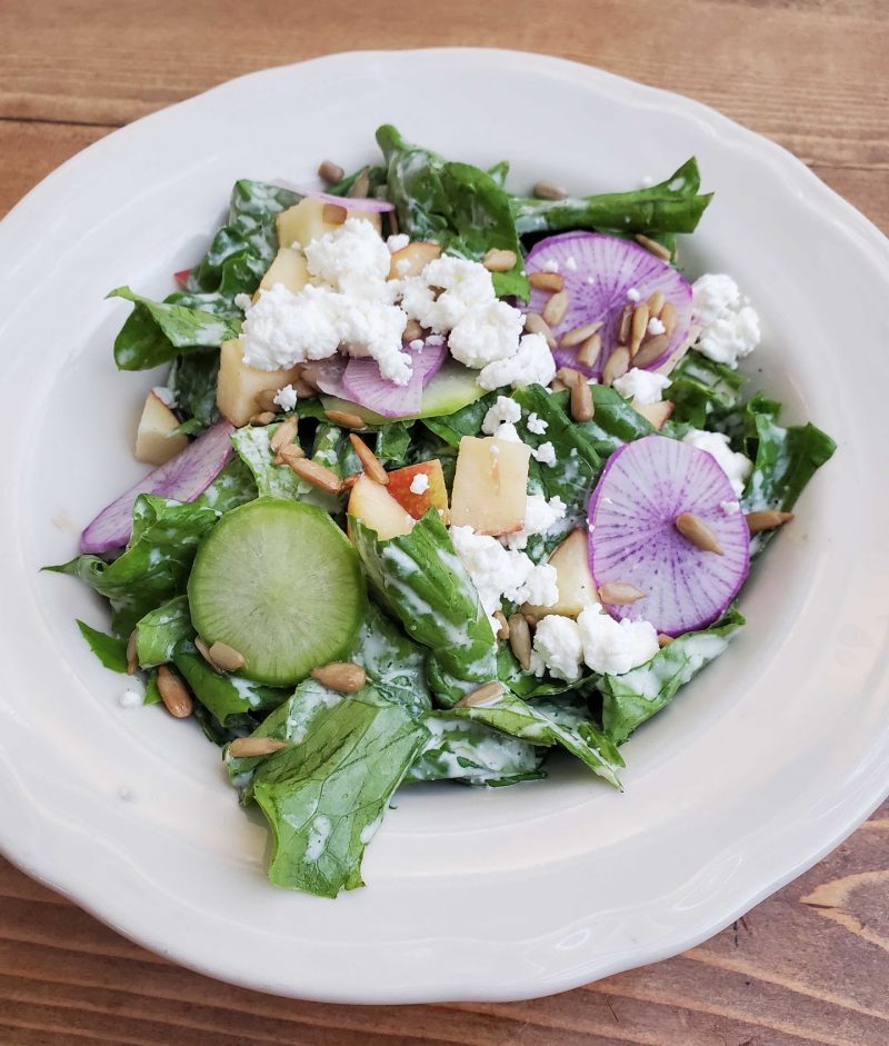 Order: DTR Salad with mixed greens, toasted walnuts, fresh apples, dry fig, honey vinaigrette, and goat cheese. Add chicken, salmon, or tuna for extra yumminess.