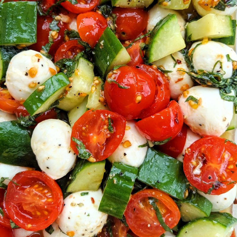 Order: An Italian classic, Caprese Salad. Fresh tomato, cucumber, mozzarella, basil, and their house white balsamic blend.