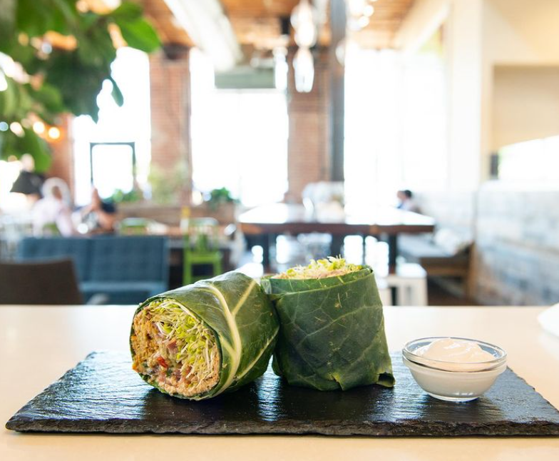 Order: Living Burrito – chipotle hummus, pico de gallo, cauliflower rice, sprouts, guacamole, cashew sour cream, wrapped in a collard leaf served with a side.