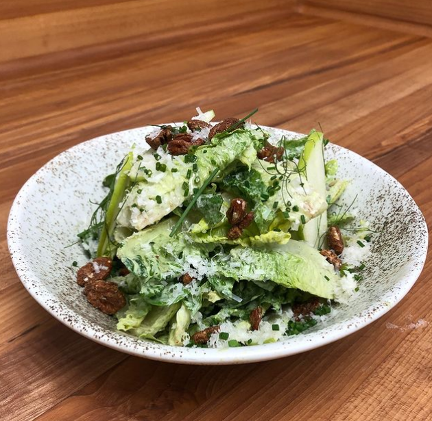 Order: Enjoy fruits of the season with the Little Gem Salad — parmesan, local n.c. apple, toasted bread crumbs, spiced pecans, green goddess; $13.