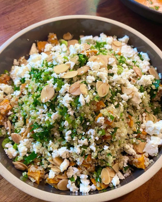Order: Quinoa salad — quinoa, parsley, scallions, roasted almonds, feta cheese, roasted sweet potatoes, lemon, olive oil. Pro tip: add the marinated salmon for an extra tasty salad.