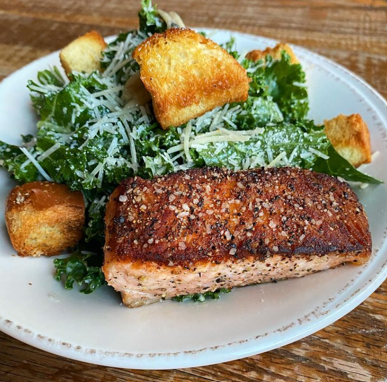 Order: Caesar salad topped with pan-seared Salmon. Delicious AND healthy.