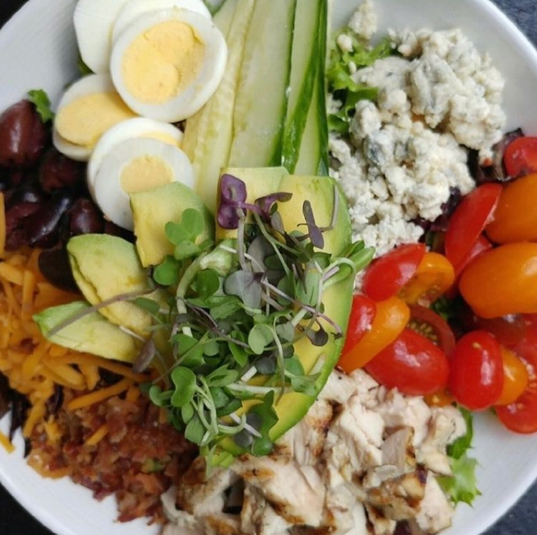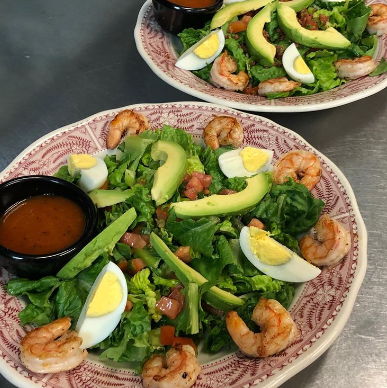 Order: Shrimp Cobb – grilled shrimp, romaine, green onions, tomatoes, avocado, chopped bacon, hard-boiled egg, honey cilantro vinaigrette; $15.49.