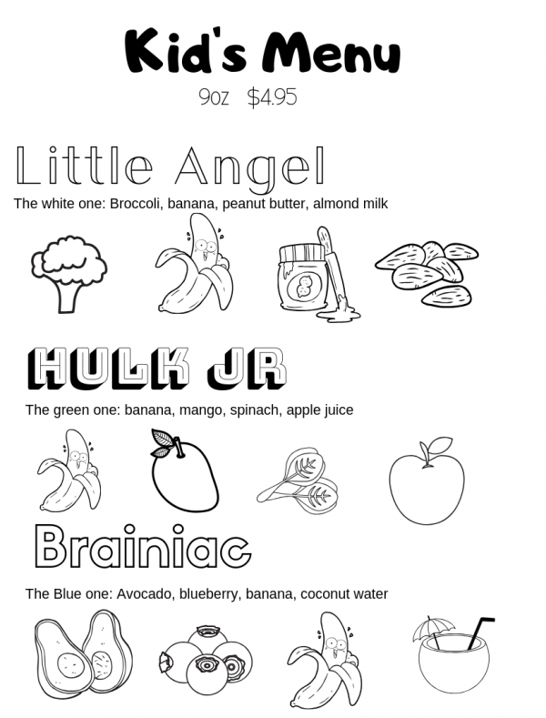 They offer 10+ Juices, Wellness Shots, Acai Bowls, over a dozen Smoothies, Gluten-Free and Vegan Grab-n-Go snacks and foods and a special kids meal.