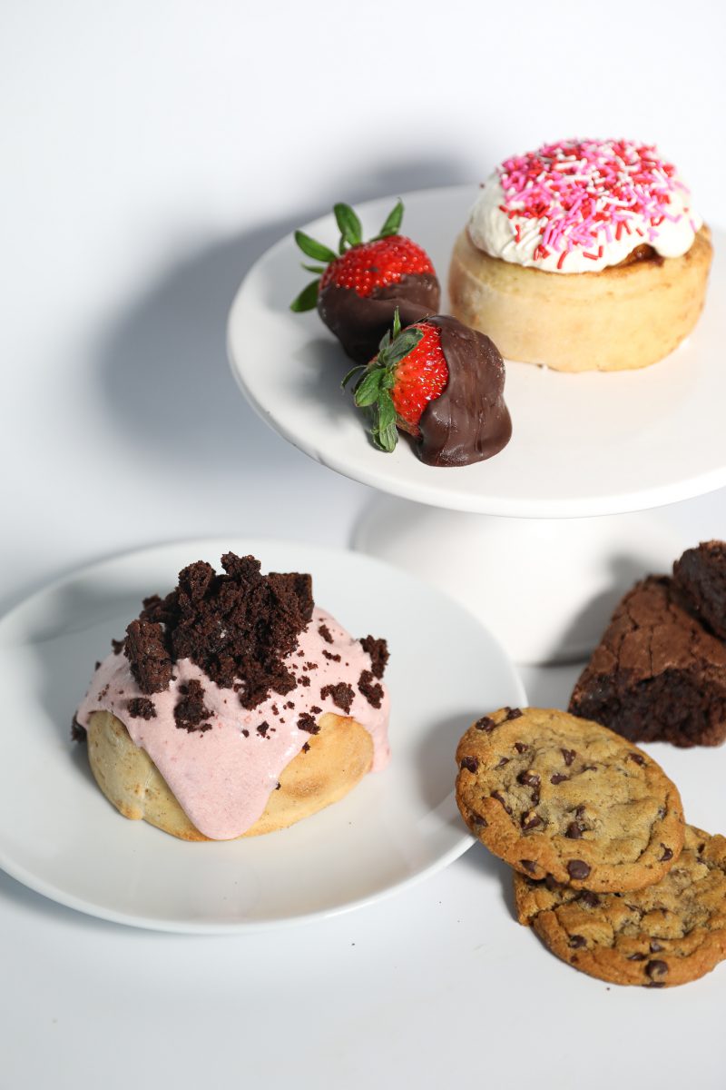 Two customized cinnamon rolls with your choice of one frosting and one topping each, two chocolate-covered strawberries, two mini cookies and two mini brownies.