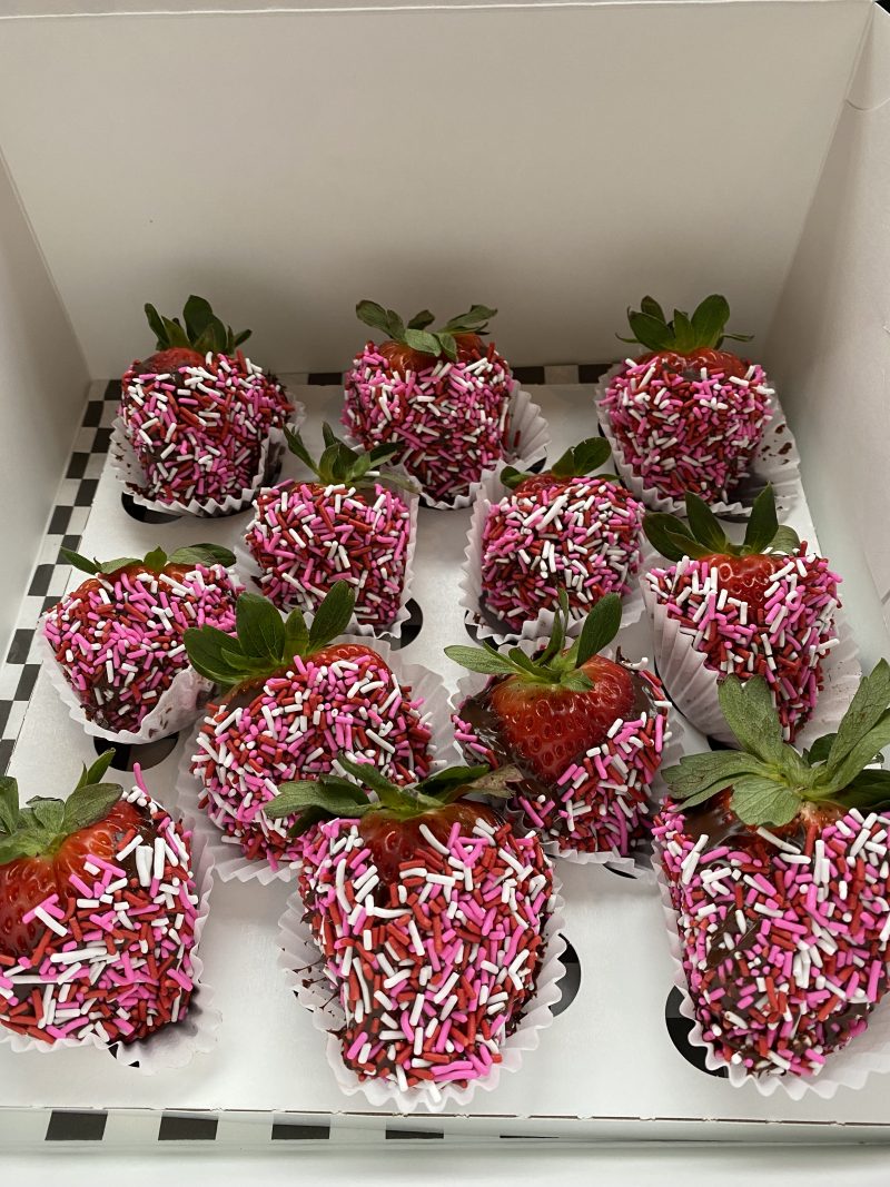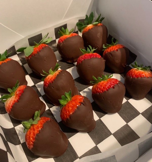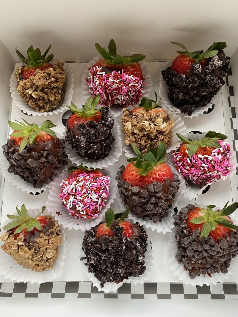 Fresh strawberries hand-dipped in dark chocolate and rolled in a variety of toppings. Includes chocolate chips, ‘oreos’, homemade pie crumble, and sprinkles.