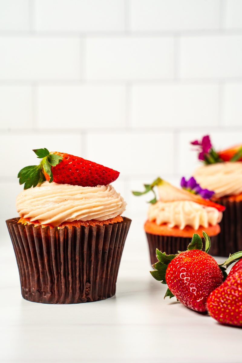 - Triple Strawberry cupcakes – fresh strawberry cake, strawberry buttercream, and topped with a fresh strawberry