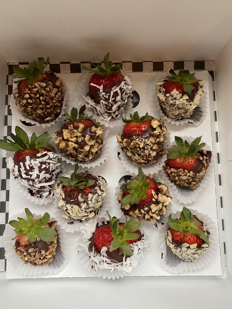 Fresh strawberries hand-dipped in dark chocolate and rolled in a variety of nut toppings. Includes almonds, coconut, pecans, and walnuts