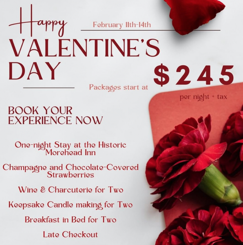 The Morehead Inn Valentines Day package offers guests a romantic evening of relaxation and creating memories. Guests are treated to an evening of live acoustic music with Wine and Charcuterie for Two, Keepsake Candle Making, Champagne and Chocolate-Covered Strawberries, and a Something Classic Breakfast in Bed.