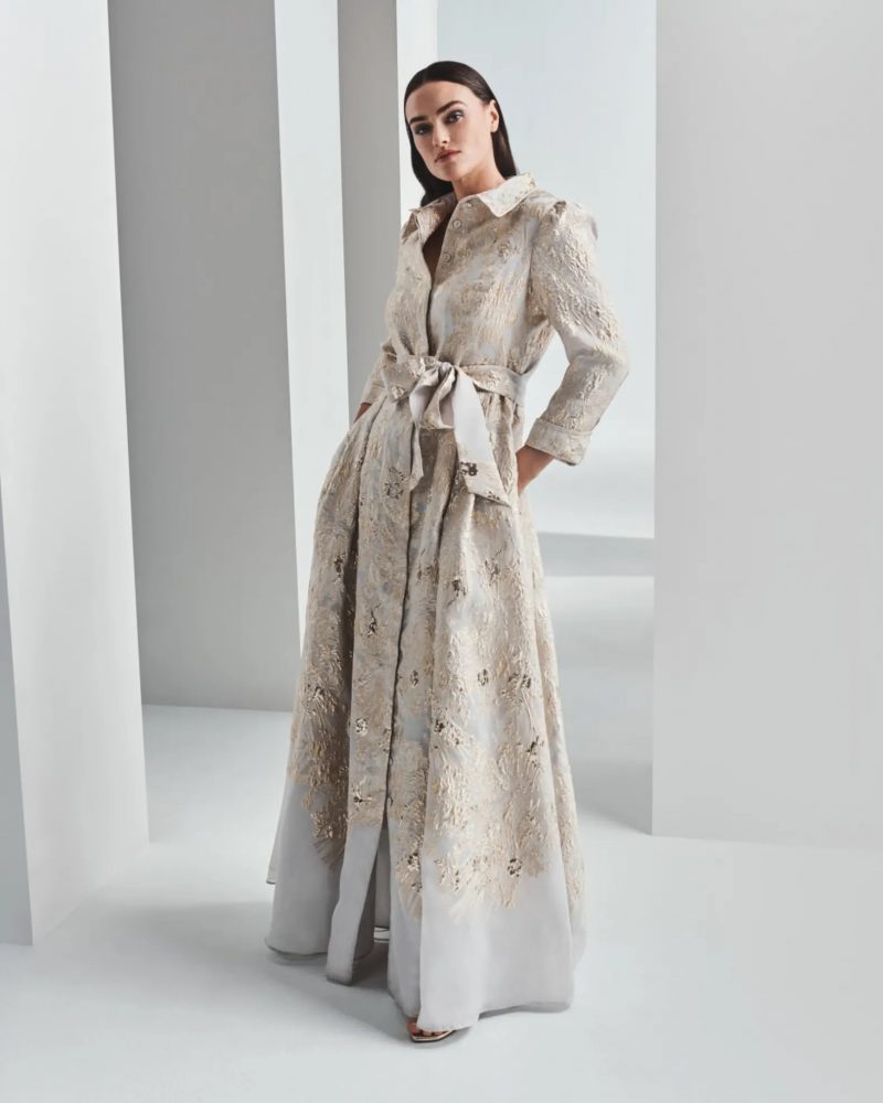 We are definitely obsessed with Shirt Dress Gowns this spring. Neiman Marcus RICKIE FREEMAN FOR TERI JON Metallic Brocade Shirtdress Gown BUY ONLINE HERE $860
