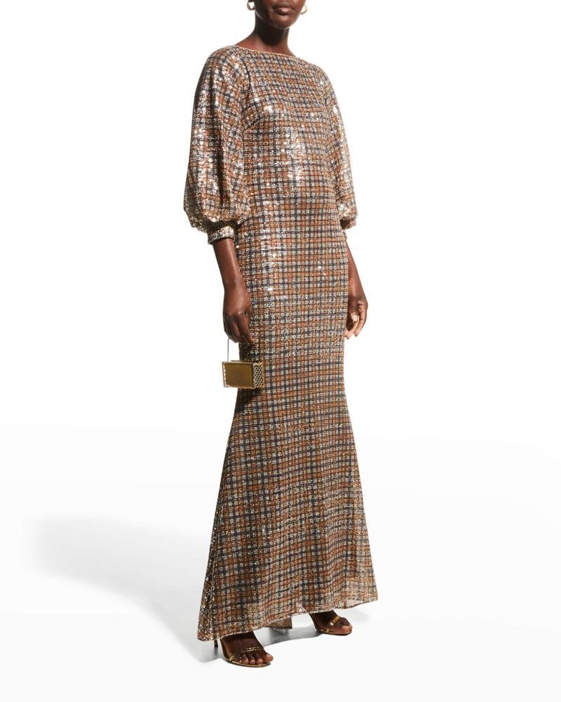 NEIMAN MARCUS BADGLEY MISCHKA COLLECTION Sequin Glen Plaid Full-Sleeve Gown BUY ON SALE ONLINE $750$367