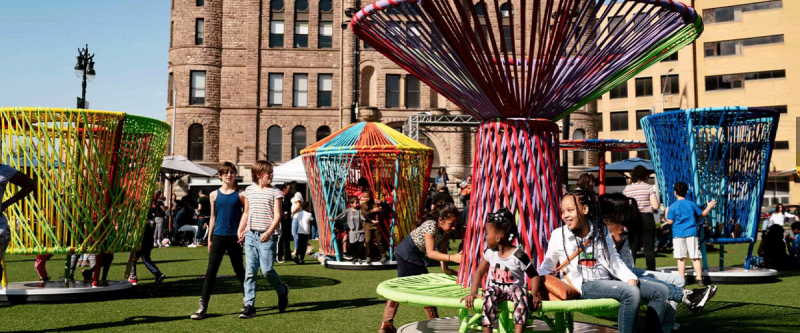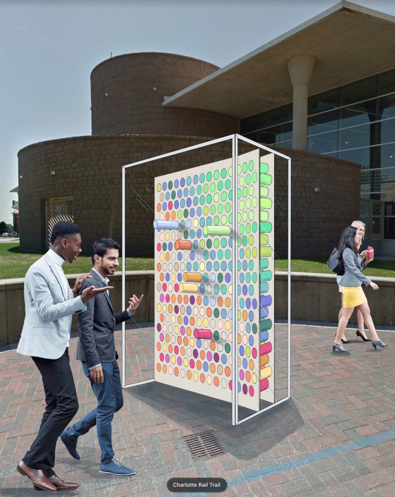 - Los Trompos from artists Hector Esrawe, Ignacio Cadena at the Levine Center for the Arts, featuring eight larger-than-life, three-dimensional spinning tops in a variety of colors and shapes. The colorful surfaces of each top are created in part by fabric woven in a traditional Mexican style.