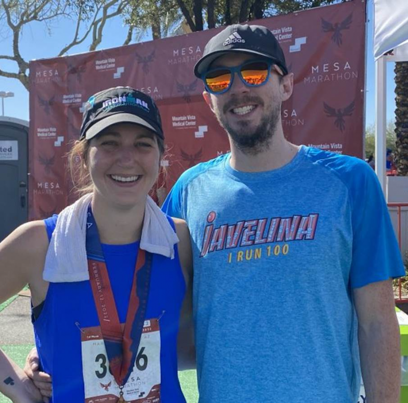 He’s originally from Charleston, where he started running while in Physical Therapy school there. He was inspired by some classmates who had completed the Boston Marathon multiple times. He has been running for more than eight years and uses it as a way to stay healthy. He loves working with runners and helping them return to the sport or reach their goals. Here he is with his wife after she completed the Mesa Marathon this year.