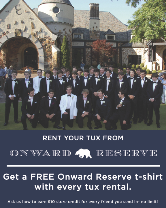 Onward Reserve in Park Road Shopping Center is the QC’s go to for renting a tux, as well as buying that first tux, and we reached out for the scoop on options and advice on acquiring this important piece of menswear. Onward Reserve has a huge book of styles, swatches, and pictures to see for him to rent or buy his tux. Every element of the formal outfit is available, at varying price points and upgrades; he can rent the most basic tux for $180 without shoes and $206 with shoes ~ this price includes pants, basic shirt, nickel plated studs, basic tie and cummerbund. Upgrades are available at additional prices.