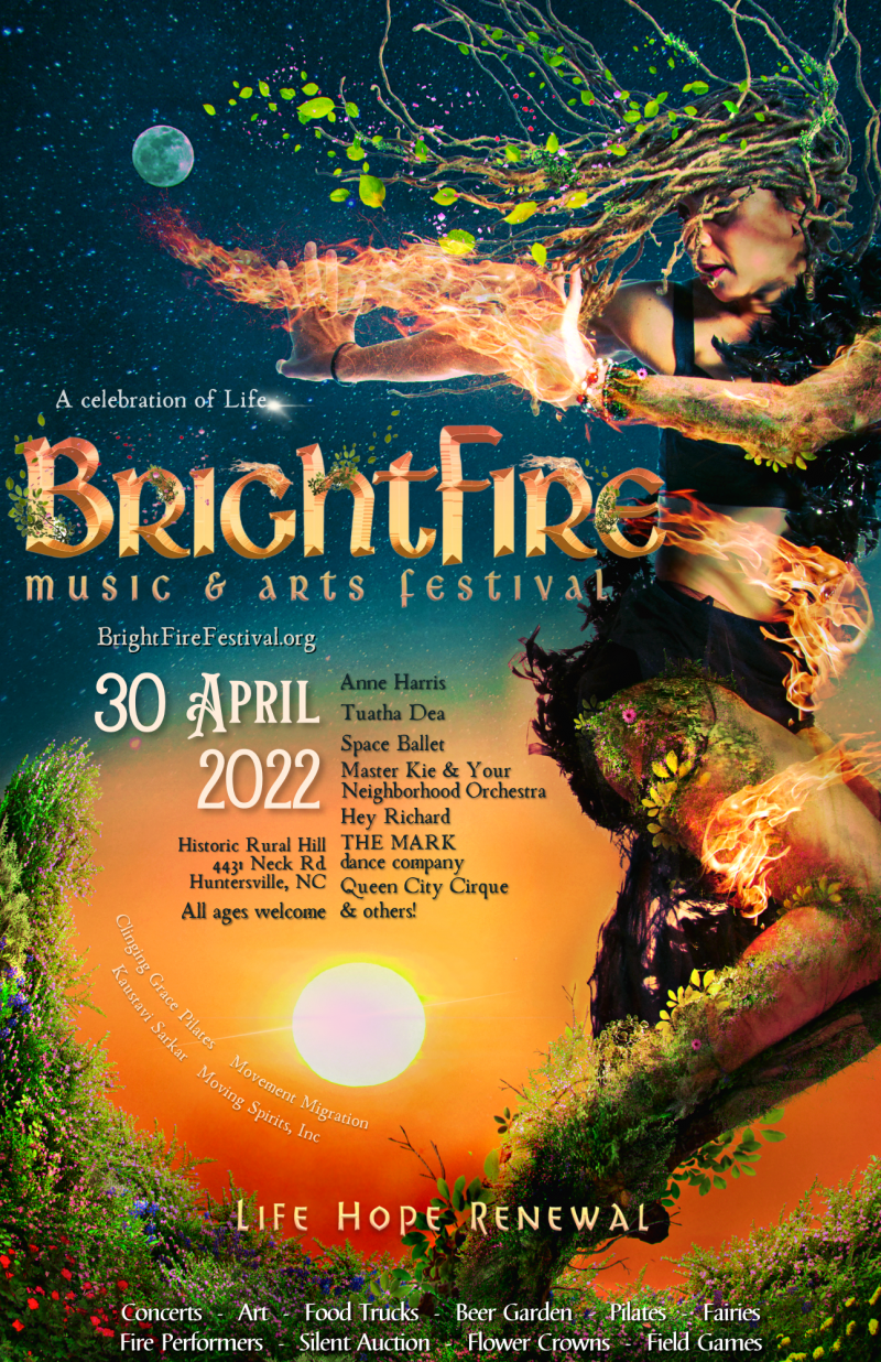 The BrightFire Music & Arts Festival is a kaleidoscopic celebration of Life, Hope, and Renewal through music, art, fire, dance, and nature. Think flowers everywhere with live music and dance, fire performances, maypoles, fairies, food trucks, a beer garden and so much more.