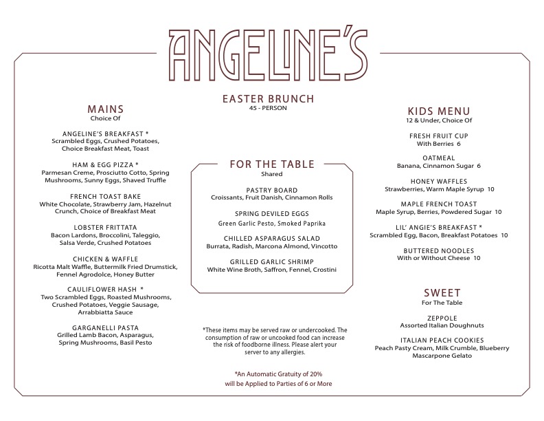 Angeline’s is offering a family-friendly Easter brunch April 17, from 10 am – 2 pm, featuring lobster frittata and breakfast pizza, and a special kids’ menu featuring honey waffles, French toast, and our Lil’ Angie’s Breakfast. (menu below)