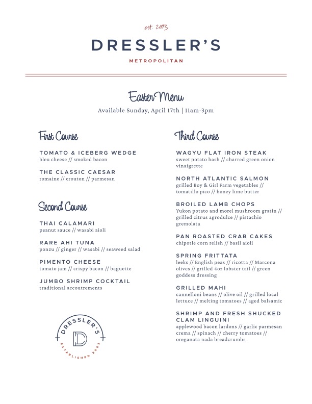 Dressler’s will have a 3 course lunch from 11 am to 3 pm for $59 per person + tax and gratuity. Reserve Here.