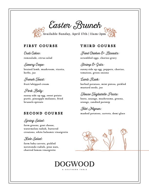 Dogwood’s Easter Brunch will be served from 11 am to 3 pm and is $75 per person (tax & gratuity included). Reserve Here.