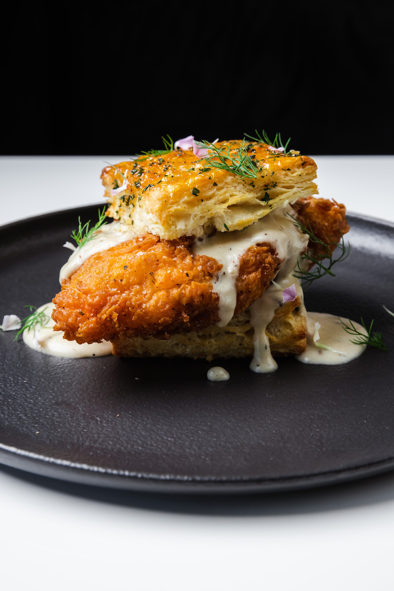 - Smothered Fried Chicken Biscuit – freshly baked thyme biscuit, fried chicken, saw mill gravy, hot sauce
