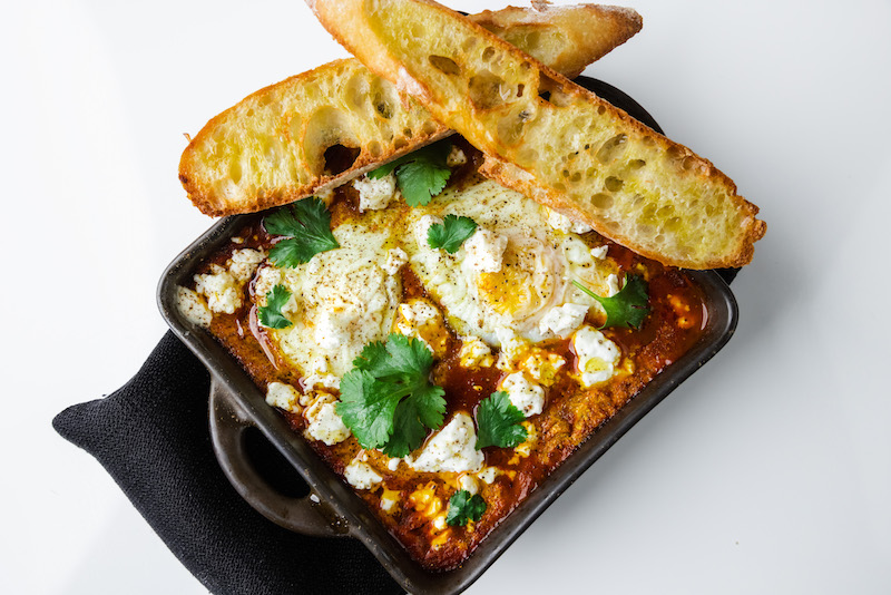 - Shakshuka – stewed tomatoes, barrel aged feta, cilantro, toasted baguette