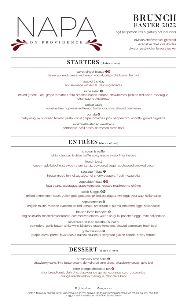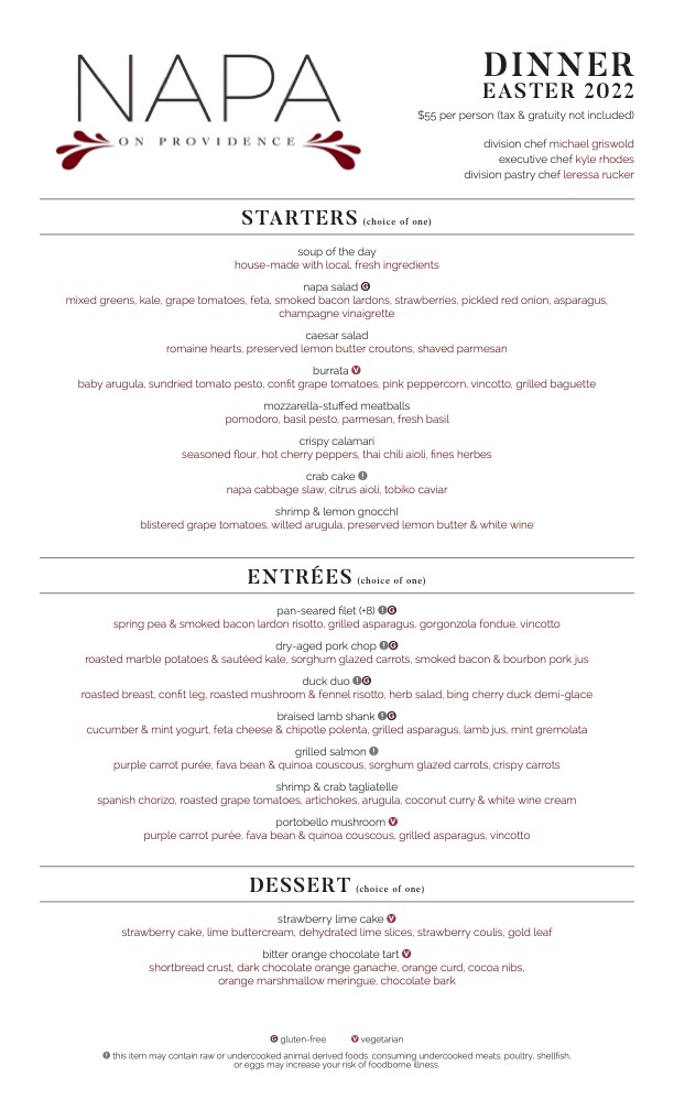 - Napa on Providence (Charlotte) and Napa at Kingsley (Fort Mill) have special Easter menus for both – menus below