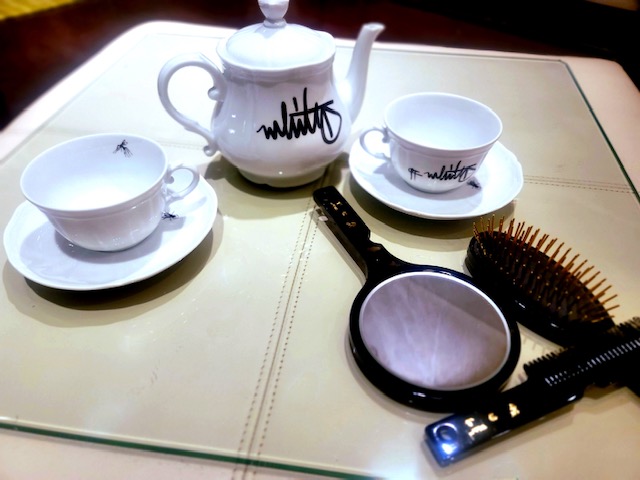 Blooms that require no water!  Porcelain tulip, hydrangea, and orchid on lucite base