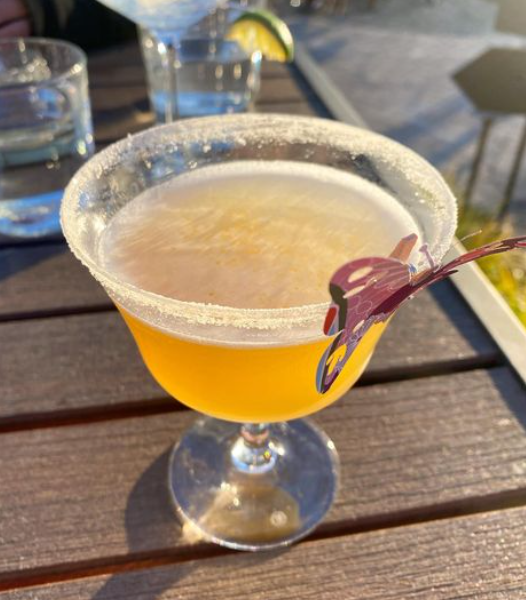 Another summertime favorite, the Honey Bee and the Buzzing Monk features London Dry gin, yellow chartreuse, saffron-infused local honey, lemon, and vanilla honey Szechuan flower rim. Best enjoyed watching the sun set on the patio.