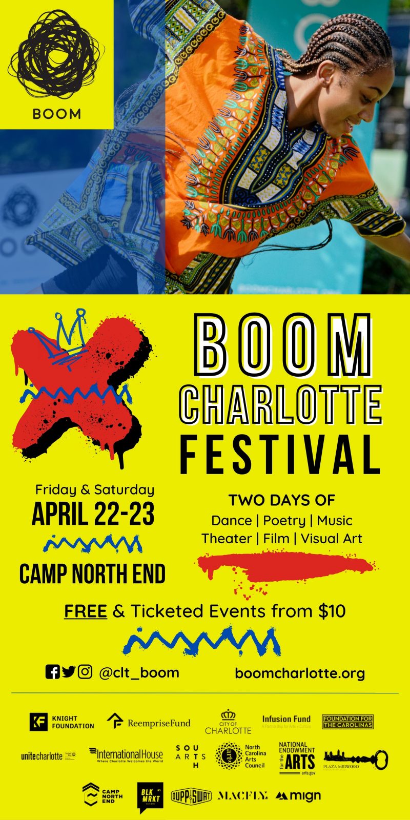 BOOM Charlotte seeks to showcase artists from various disciplines including theater, dance, music, spoken word, comedy, film, visual art, public art installations and more.