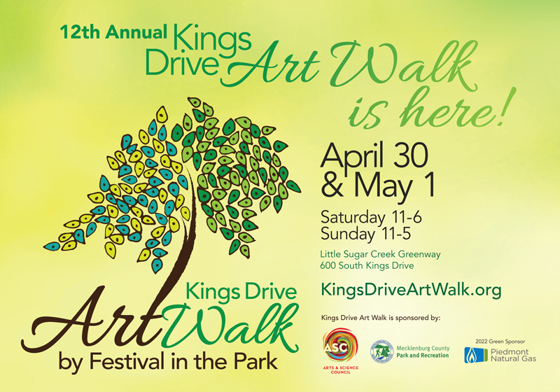 Art for Shopping at the 12th Annual “Kings Drive Art Walk” Saturday, April 30, 2022 11:00 am – 6:00 pm and Sunday, May 1, 2022 11:00 am – 5:00 pm located on the Little Sugar Creek Greenway at 600 South Kings Drive, (at the corner of East Morehead St.), Charlotte. FREE event featuring more than 70 artists, musicians and more.