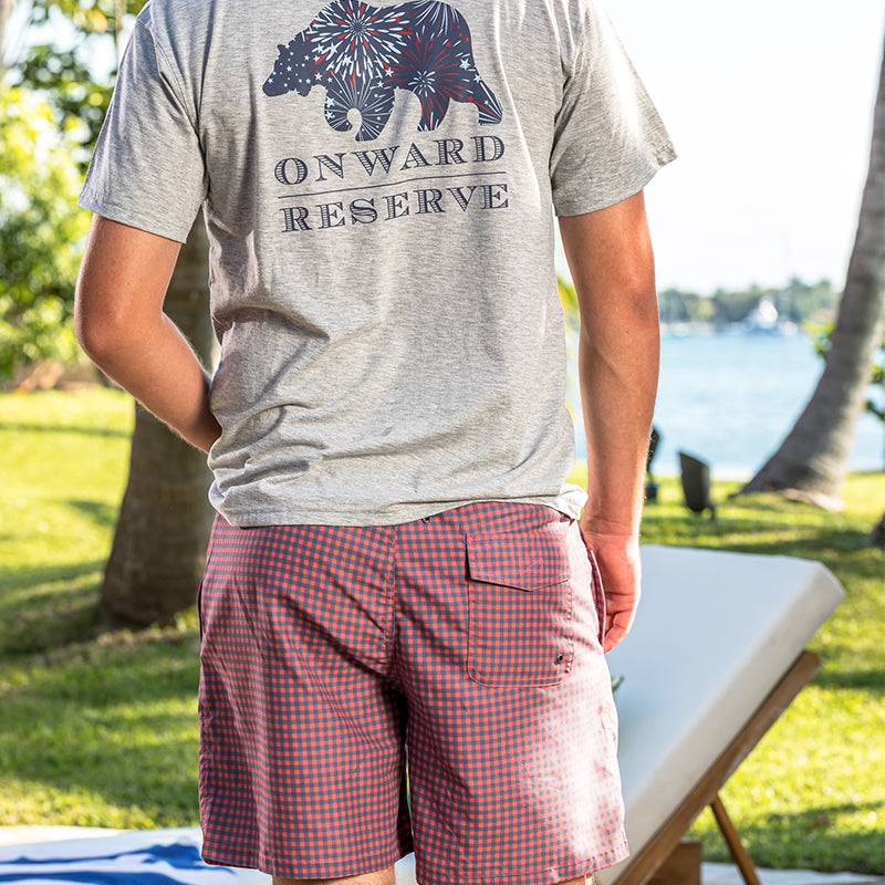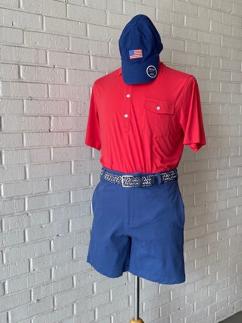 Put something together with Susan and Jason at the CLT Onward Reserve store in the PRSC like this Onward Reserve Old School Polo in Red $95.00 Also available in other colors, including White and Ombre Blue. The deep, four button placket, buttoned pocket and 100% cotton feel make this new polo extra special. And extra old school. Works on the course, the court or for cocktails. Add their Onward Reserve Bennett Short in Navy $87.50, a mostly cotton short, with just enough added stretch, and finish with the Kleinberg Marine Sport Stretch Belt with Crocodile Tabs $195.00 and a Smathers & Branson American Flag Needlepoint Hat $39.50