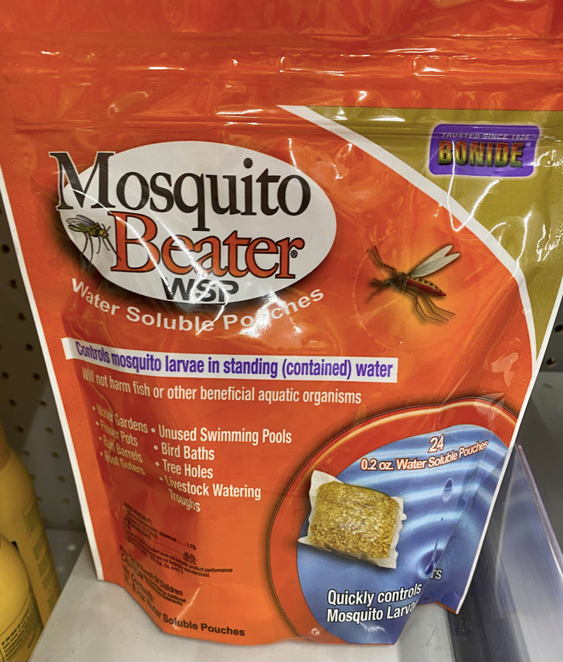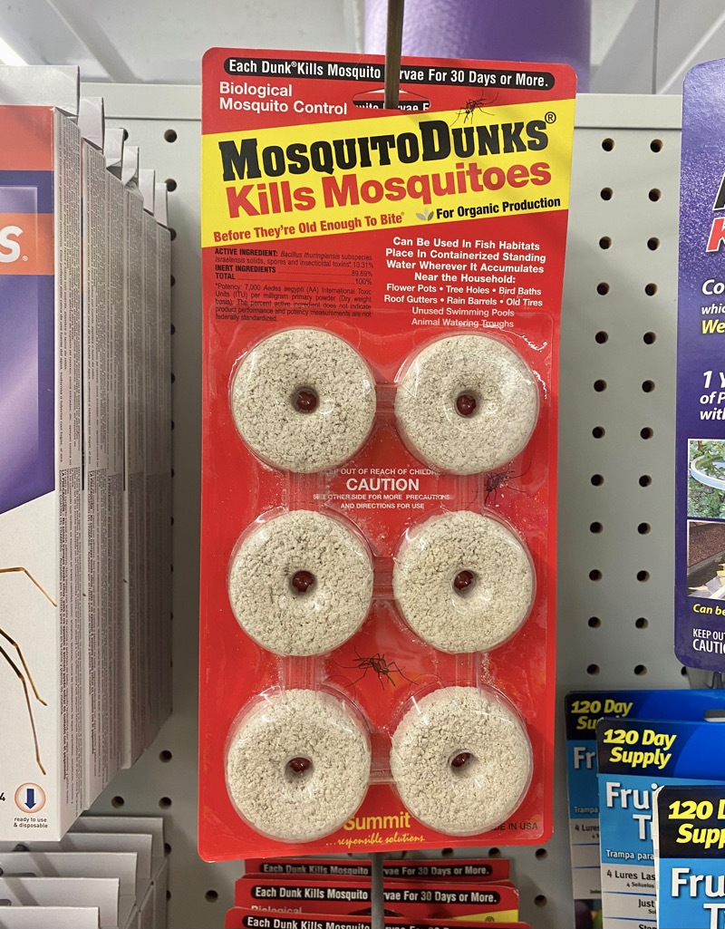 Another option Sally offers are mosquito dunks. They look like small, beige donuts – they float on standing water, and as they slowly dissolve, they release a bacterium which is toxic to all species of mosquito larvae.