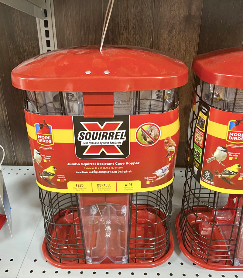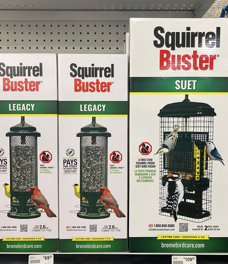 To say farewell to squirrels, Sally recommends squirrel resistant feeders noting that Squirrel Buster by Brome is her favorite. Where you place the feeder is also important – on average a squirrel can stick a landing from 10 feet away, so pay attention to the distance from any potential jumping off spots.