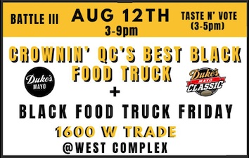 Don’t miss part 3 of the competition to crown the QC’s Best Black Food Truck! Check out Black Food Truck Friday at 1600 W Trade and cast your vote to get competitors to the final round – taking place on September 3rd at the Duke Mayo Classic FanFest.