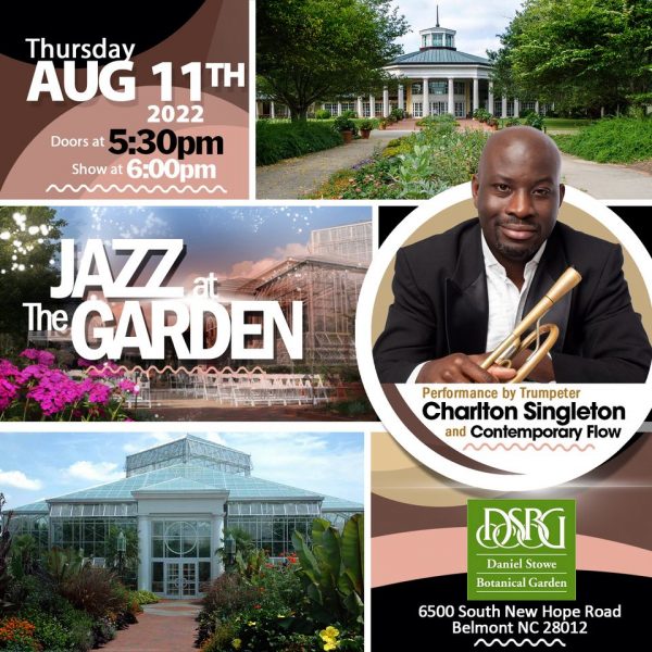 Stroll the grounds of Daniel Stowe and enjoy the stylings of Charlton Singleton and Contemporary Flow. Bring a lawn chair and a picnic to enjoy during the show. The doors open at 5:30p and registration is required.