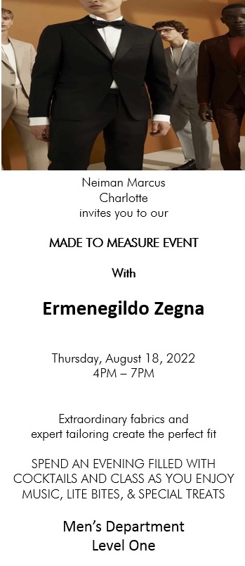 If you love men’s designer wear, and he needs a new suit, tux or more, don’t miss the Made to Measure Event with Ermenegildo Zegna at Neiman Marcus SouthPark on Thursday evening, August 18.