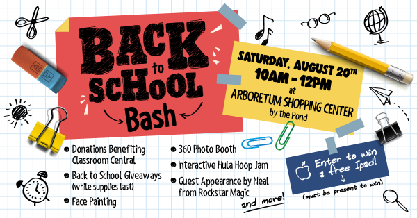 Swing by The Arboretum to celebrate Back to School season! Donate school supplies, enjoy family-friendly activities, a 360 photo booth, giveaways and a special guest appearance by Neal, from Rockstar Magic.