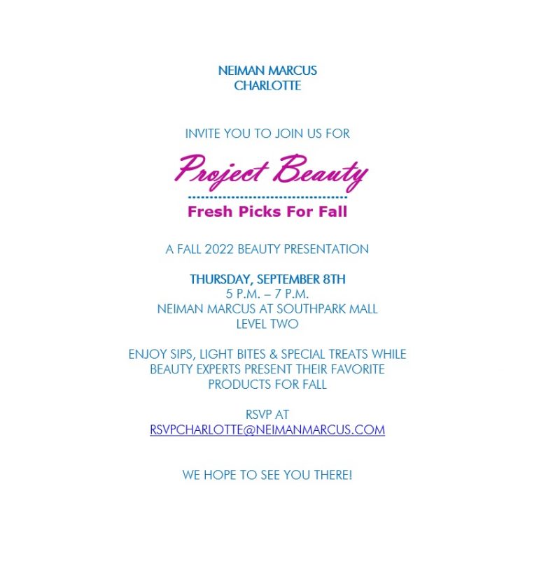 You’re Invited! Join the beauty expert at Neiman Marcus on Thursday, September 8th from 5 – 7PM to kick off NM’s fabulous annual Fall Beauty Shopping bonanza. Learn about the latest beauty tips and products from some of our favorite brands, while you enjoy Sips, Light Bites and some special treats.