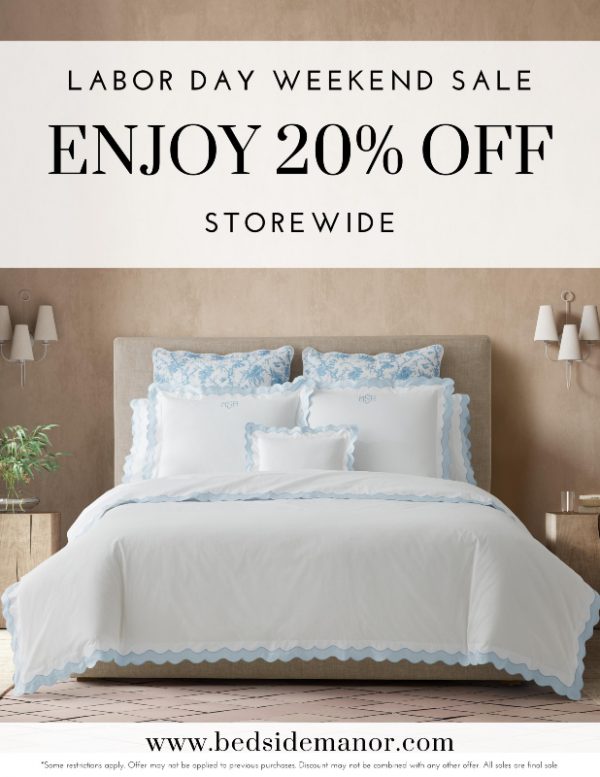 Don’t miss Bedside Manor’s storewide sale Sept 1-5! Save 20% on all in-stock and special order merchandise. Please note their holiday hours: