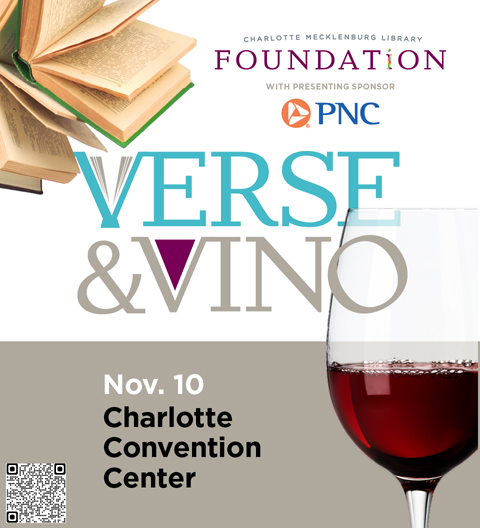Verse & Vino is an annual fundraiser for the Charlotte Mecklenburg Library Foundation, which supports programs, services, digital and print collections, and a growing endowment for the future needs of the Charlotte Mecklenburg Library. It is presented by PNC Bank, and supported by Honeywell, Bank of America, Southminster, Lowe’s, Rodgers Builders and many other corporations and private citizens. This year, the Library Foundation hopes to raise $525,000 through Verse & Vino, to support the Library’s mission to create a community of readers and empower individuals with free access to information and the universe of ideas.