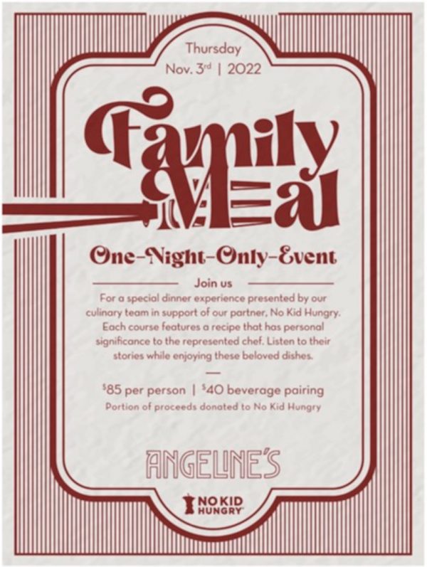 Join Angeline’s for a very special dinner experience presented in support of No Kid Hungry. Each course has been crafted by a different member of their team and features a recipe that has personal significance to them. Enjoy the stories behind these beloved dishes, while savoring every bite with a sip of perfectly paired wine.
