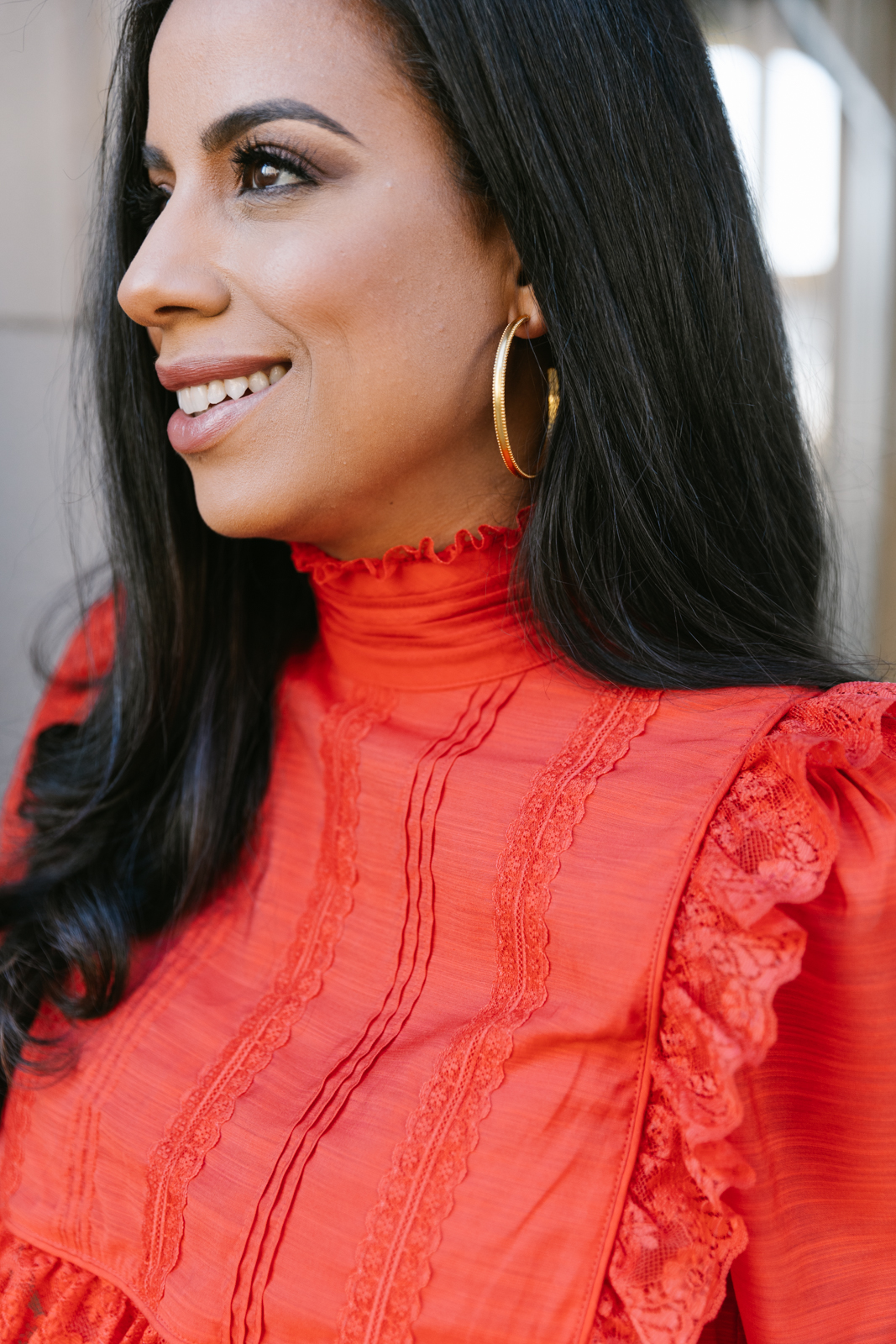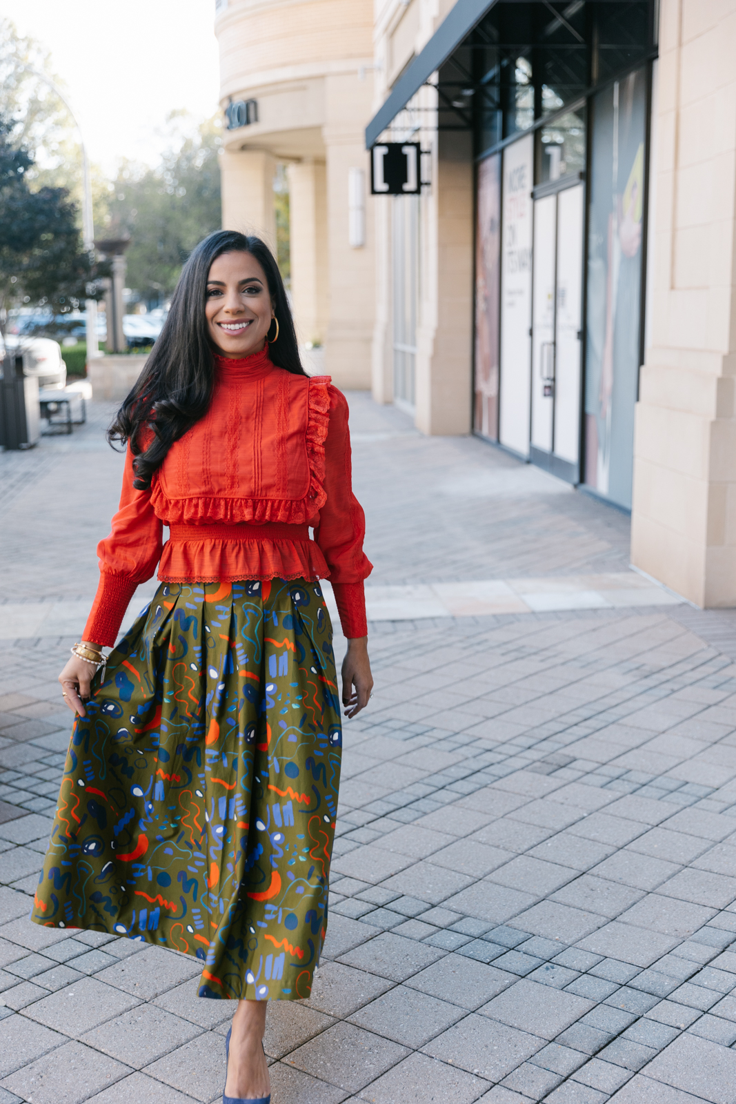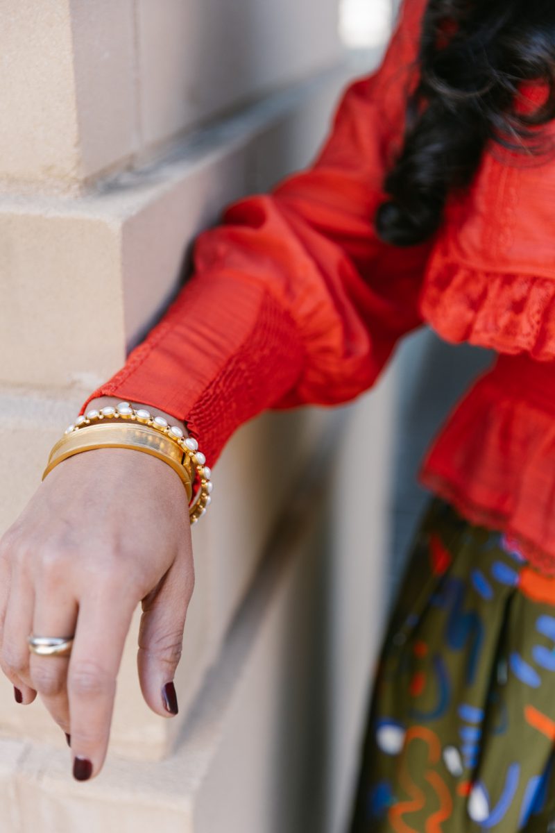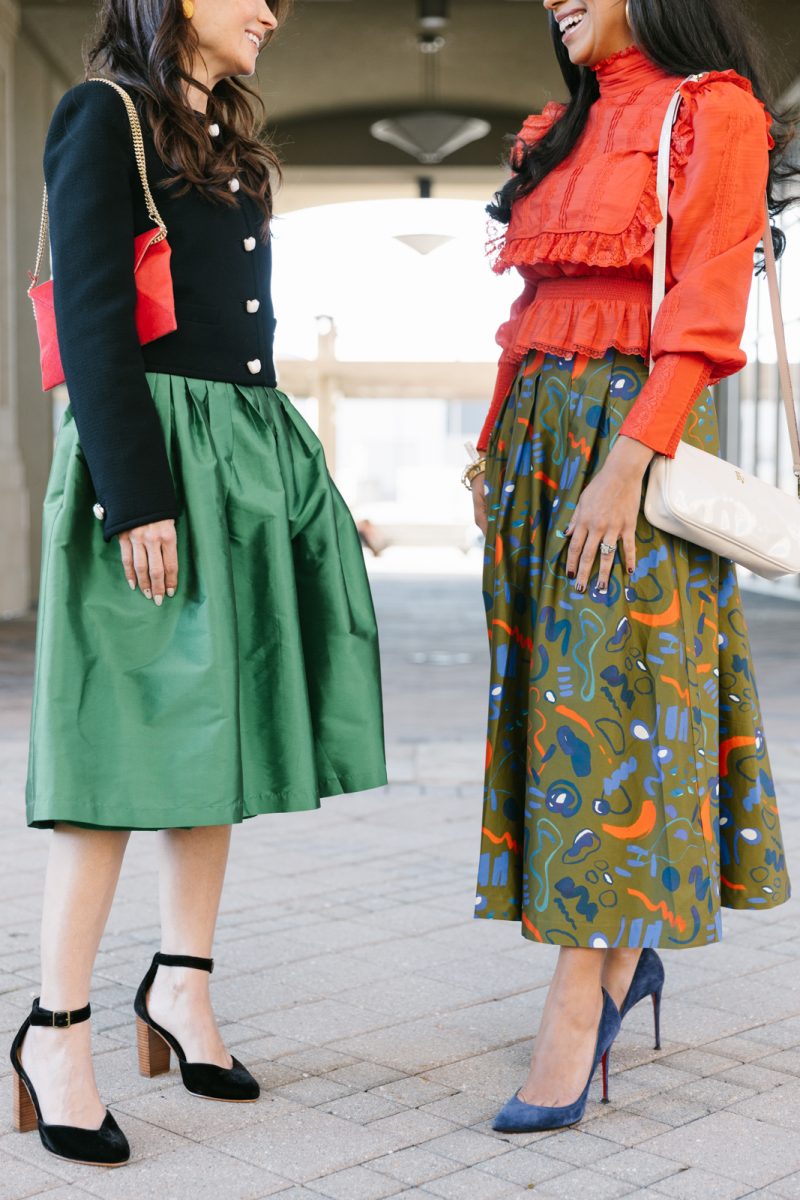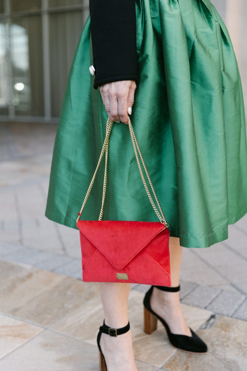Laina wears a Lafayette 148 top and Frances Valentine silk skirt with a Frances Valentine red suede bag and Julie Vos earrings