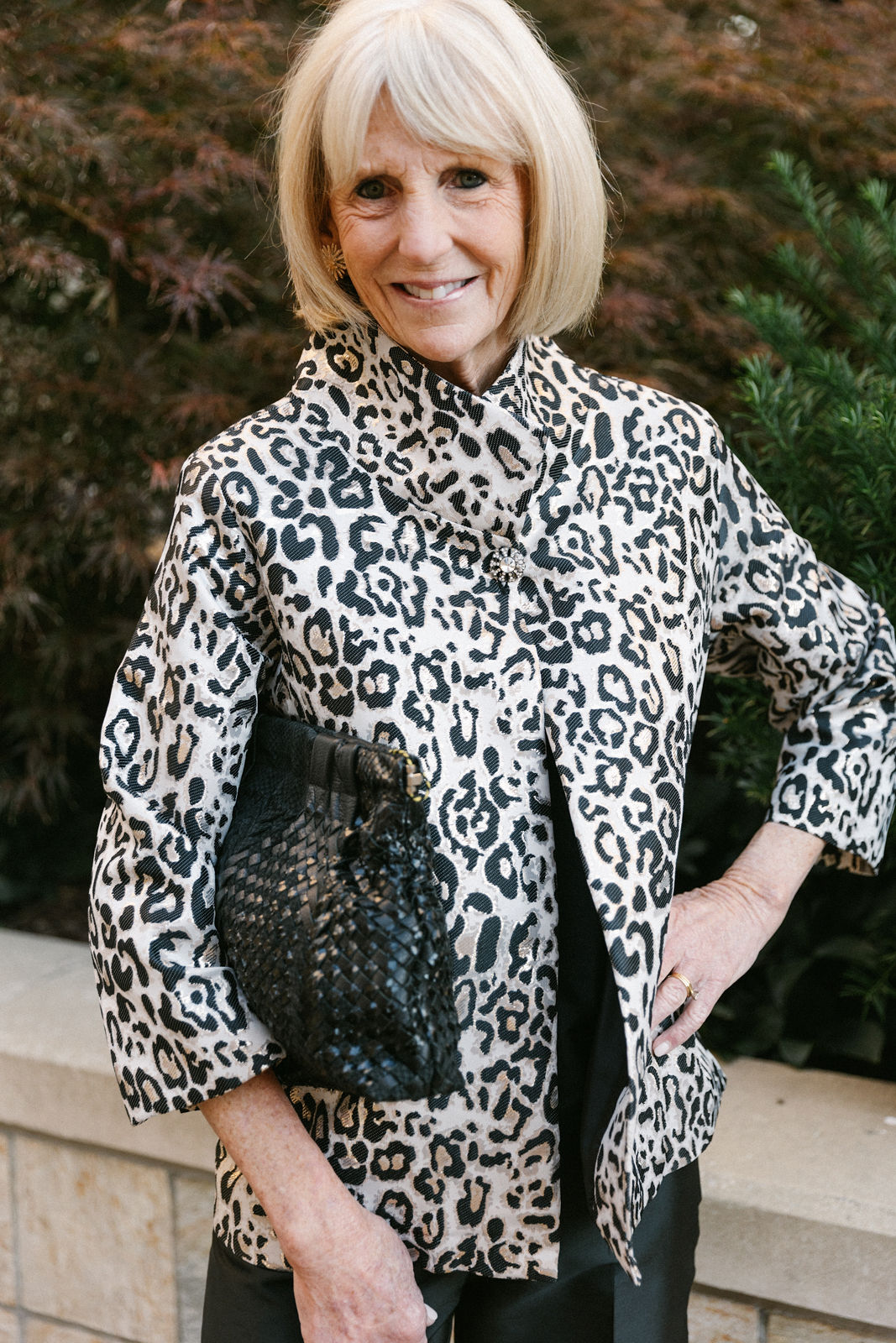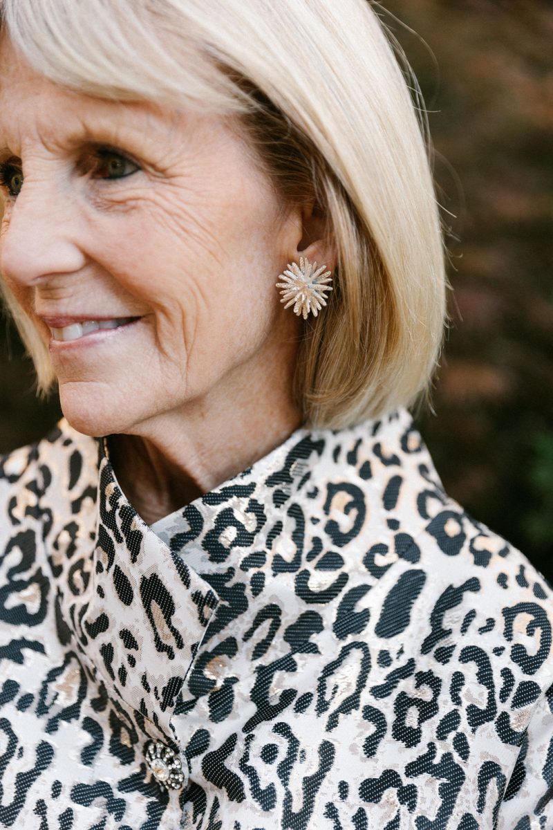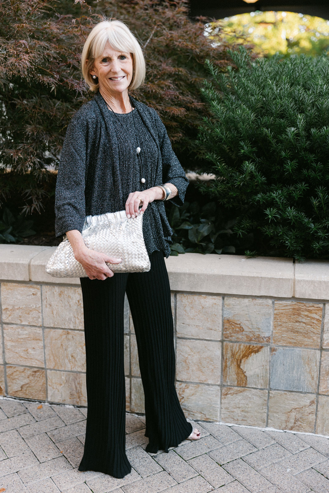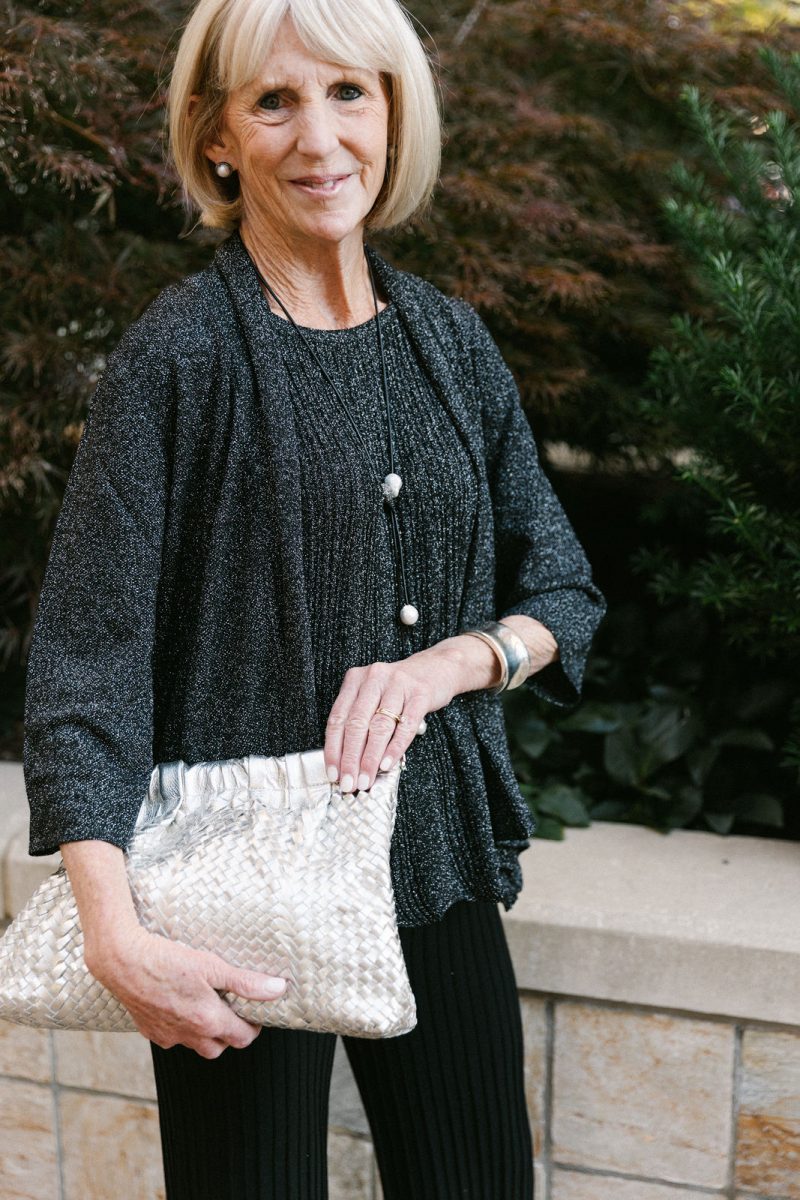 Lisa is in all Connie Roberson ~ top, jacket, pants, with Karin Sultan earrings and a Claramonte woven clutch