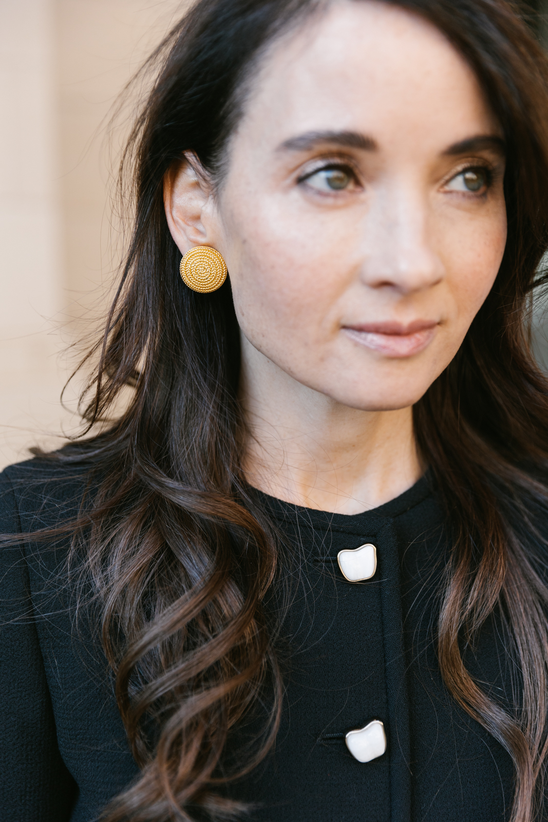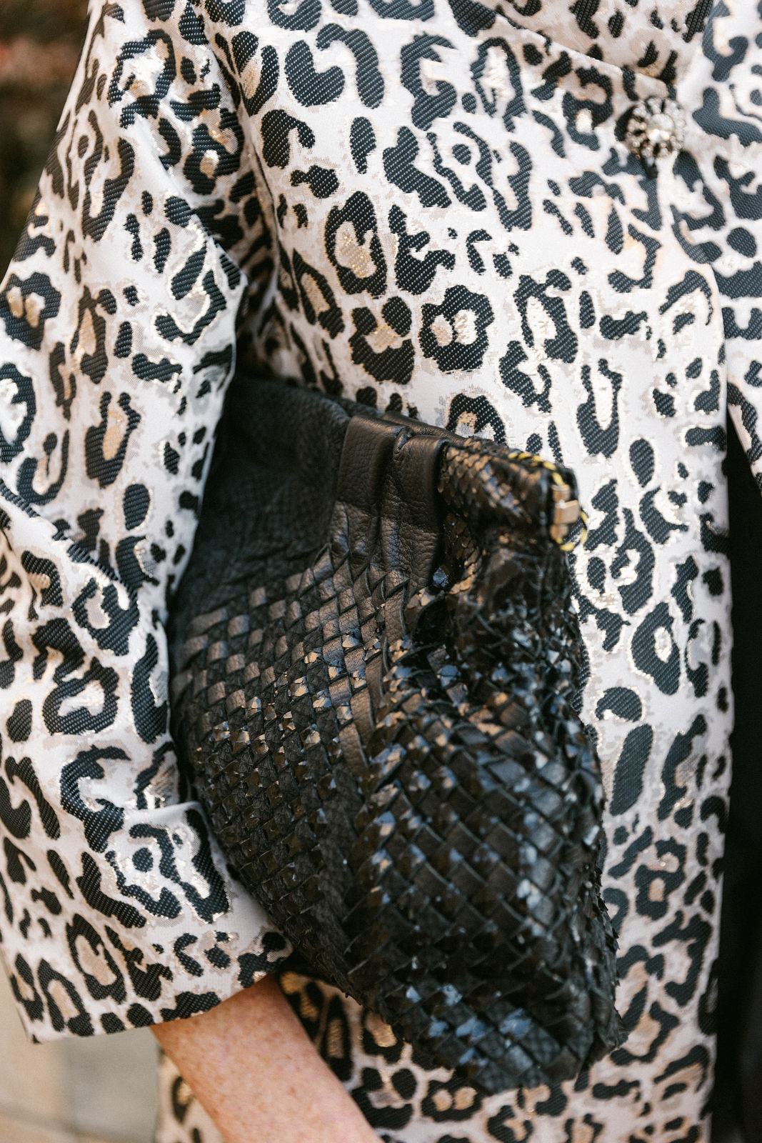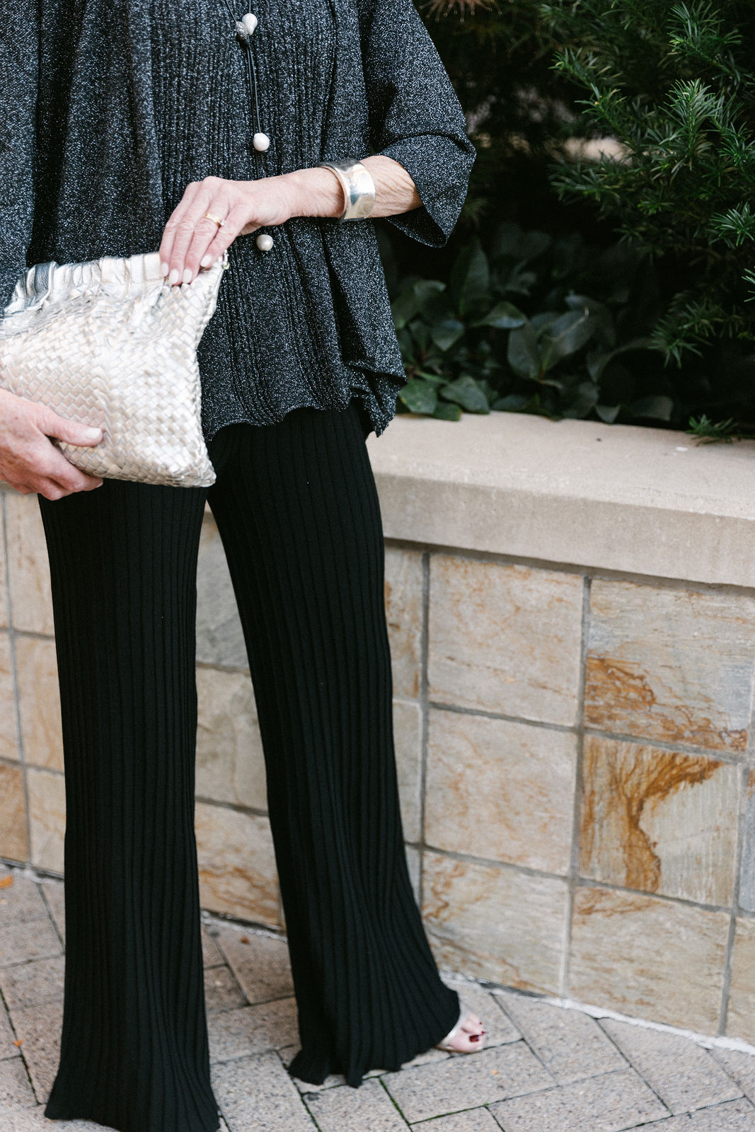 Lisa is in all Connie Roberson ~ top, jacket, pants, with Karin Sultan earrings and a Claramonte woven clutch