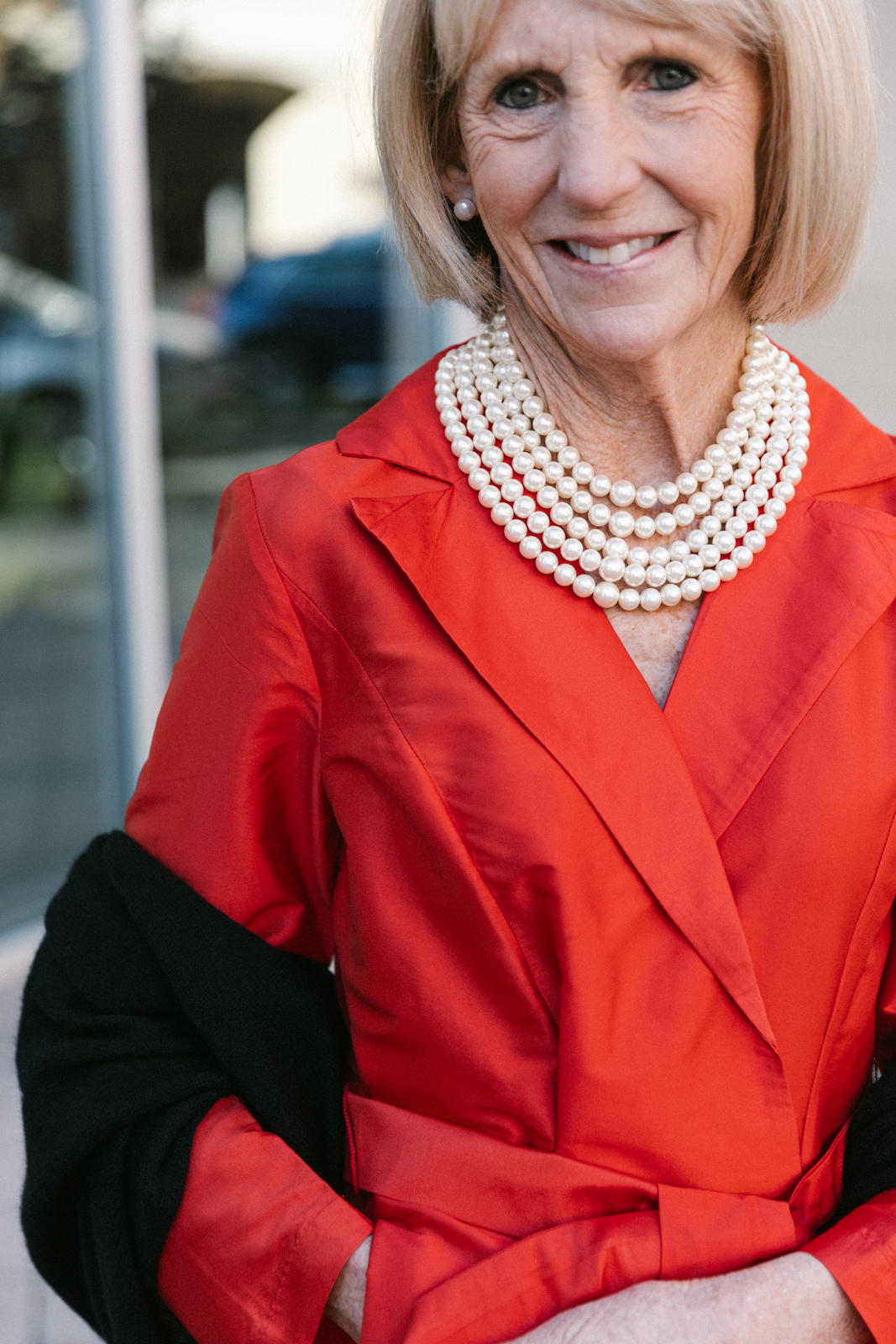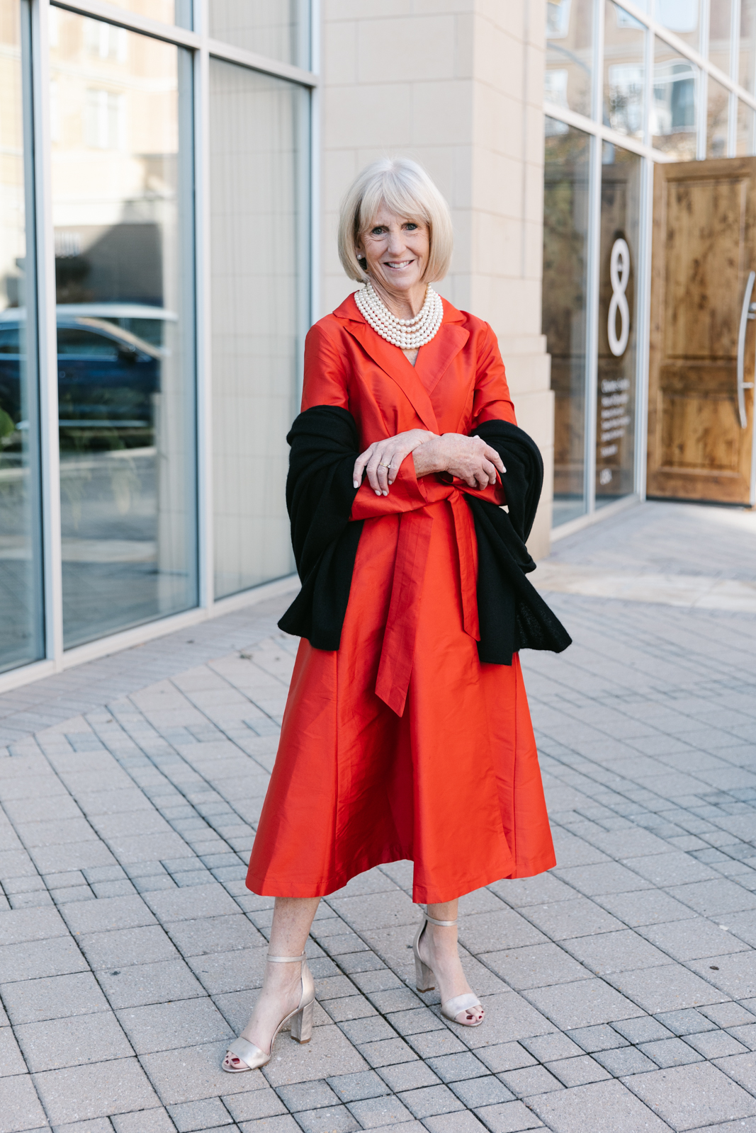 Lisa models a Frances Valentine dress, White and Warren cashmere wrap and a Fairchild Baldwin necklace and Margo Morrison pearl earrings