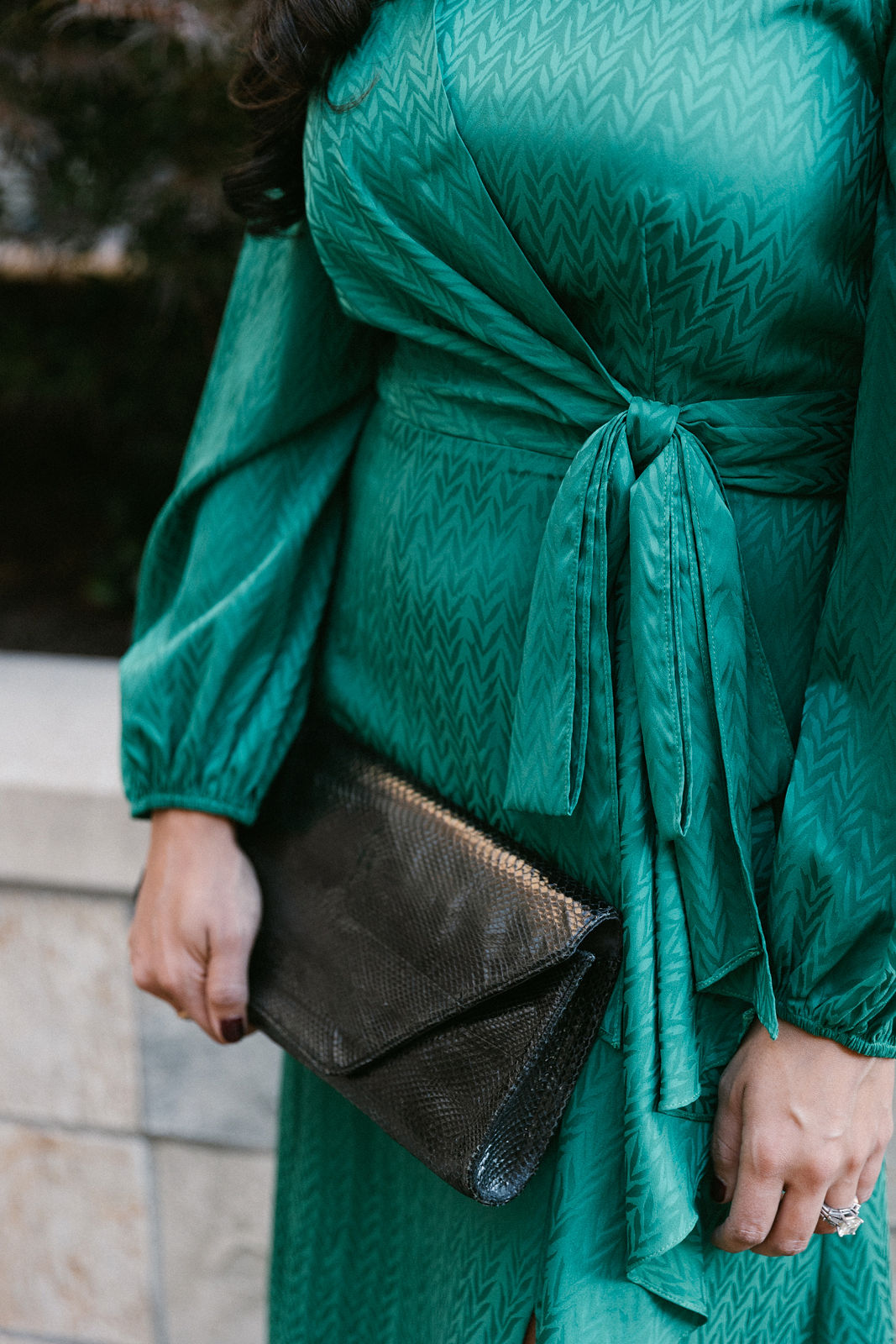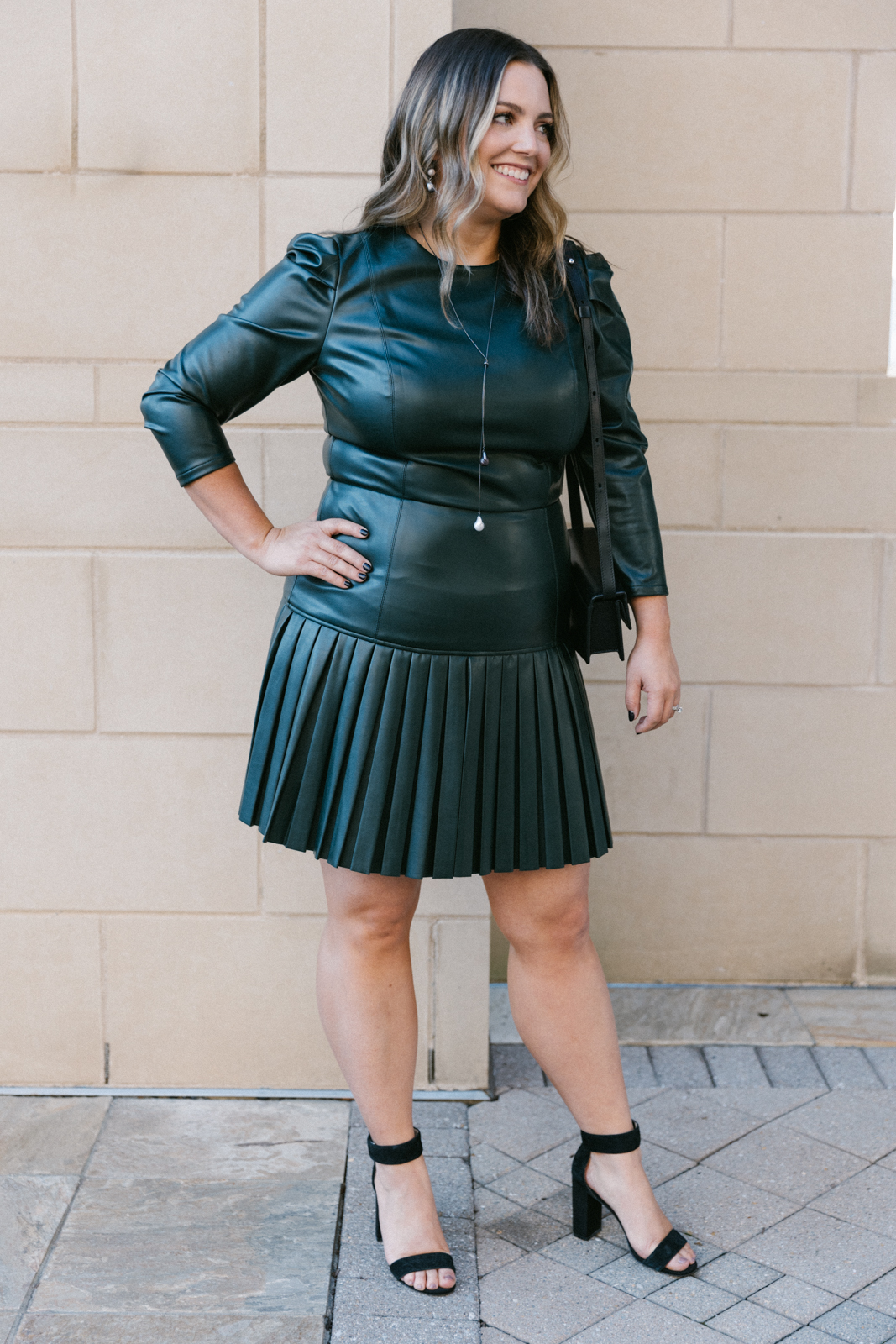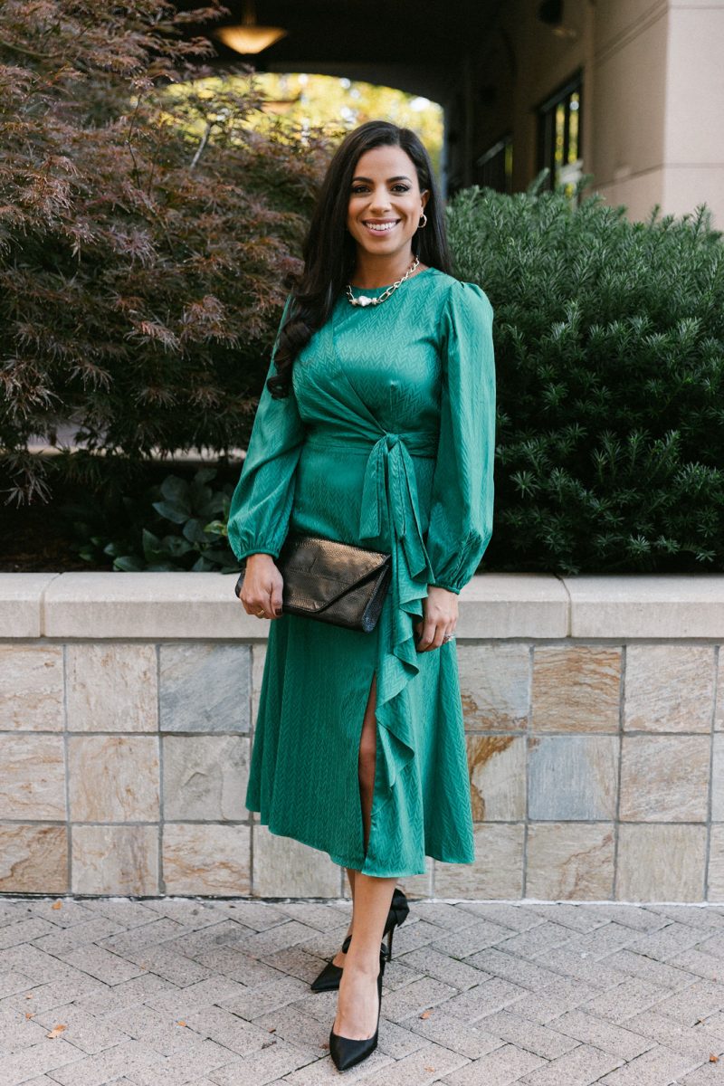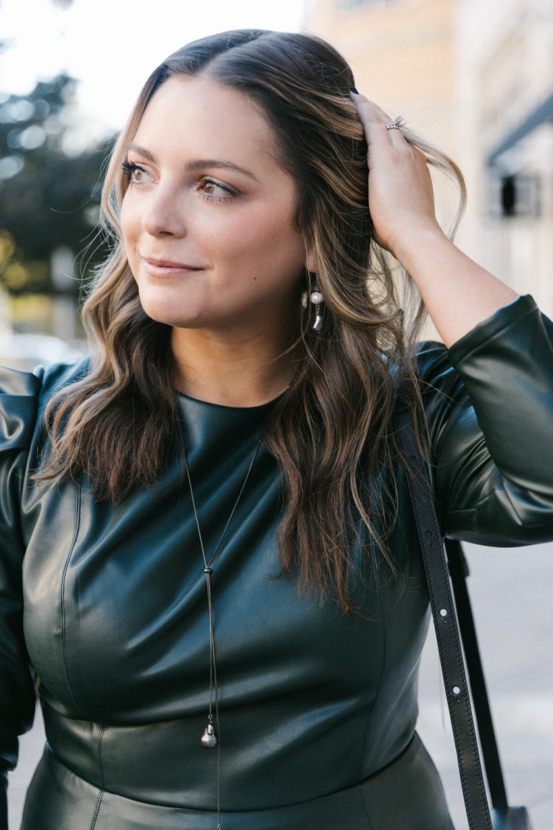 Katie is modeling a Shoshanna dark green leather dress with Margo Morrison jewelry and a Behno bag.