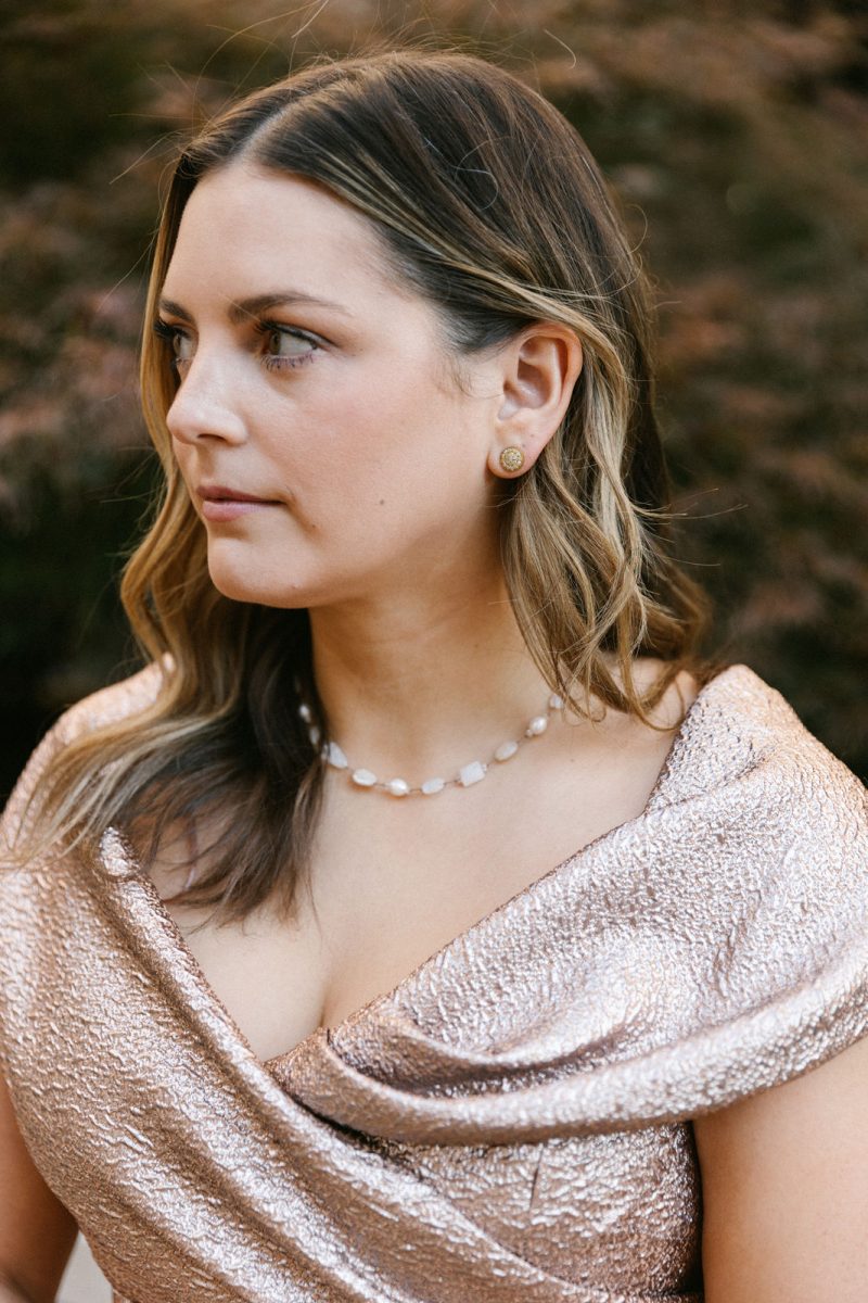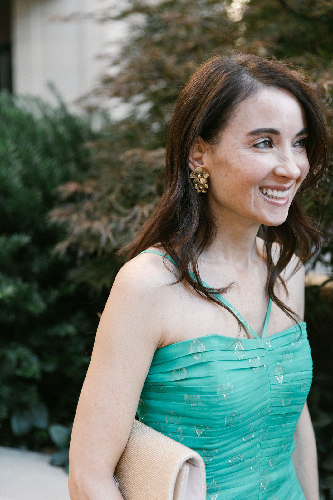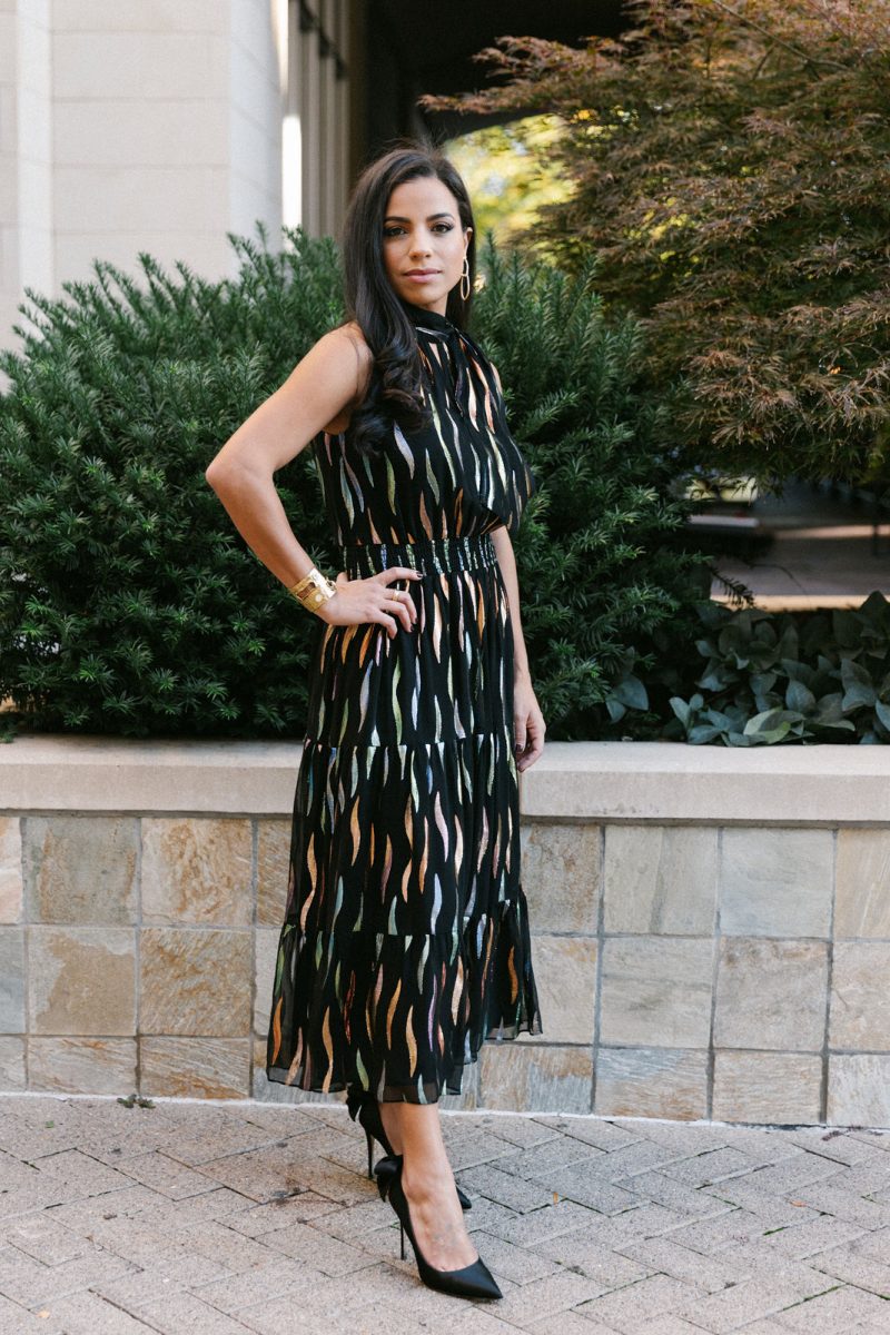 Nadia in Shoshanna with a Clara Williams necklace, Jennifer Zeuner earrings and a Beirn clutch