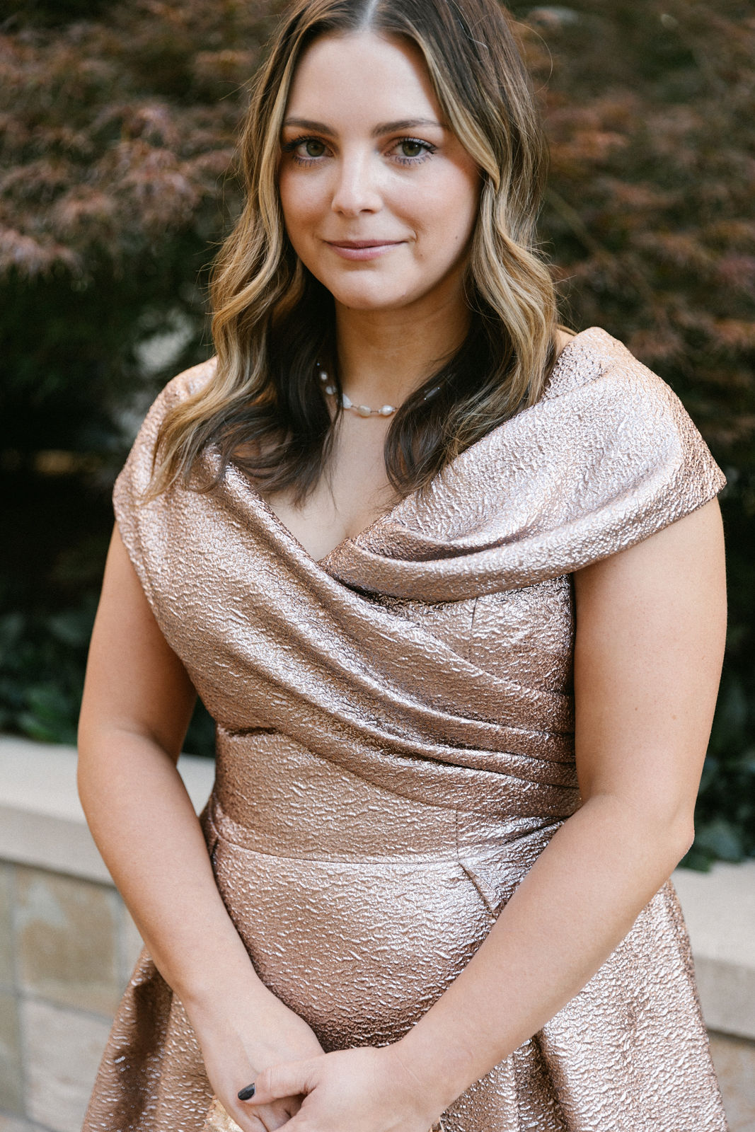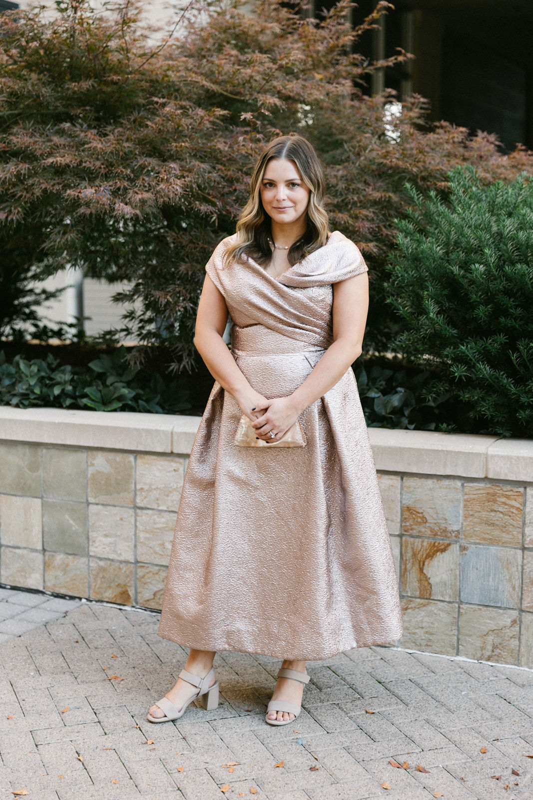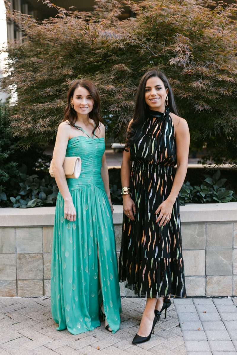 Nadia in Shoshanna with a Clara Williams necklace, Jennifer Zeuner earrings and a Beirn clutch
