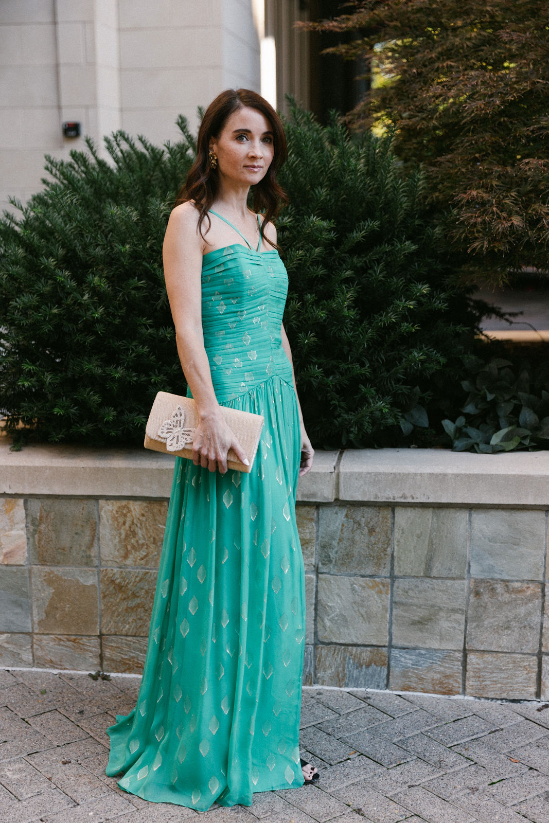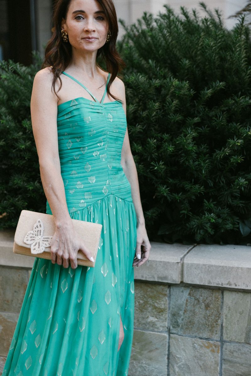 Katie is beautiful in this Teri Jon dress with Margo Morrison jewelry and a Kaleidoscope clutch