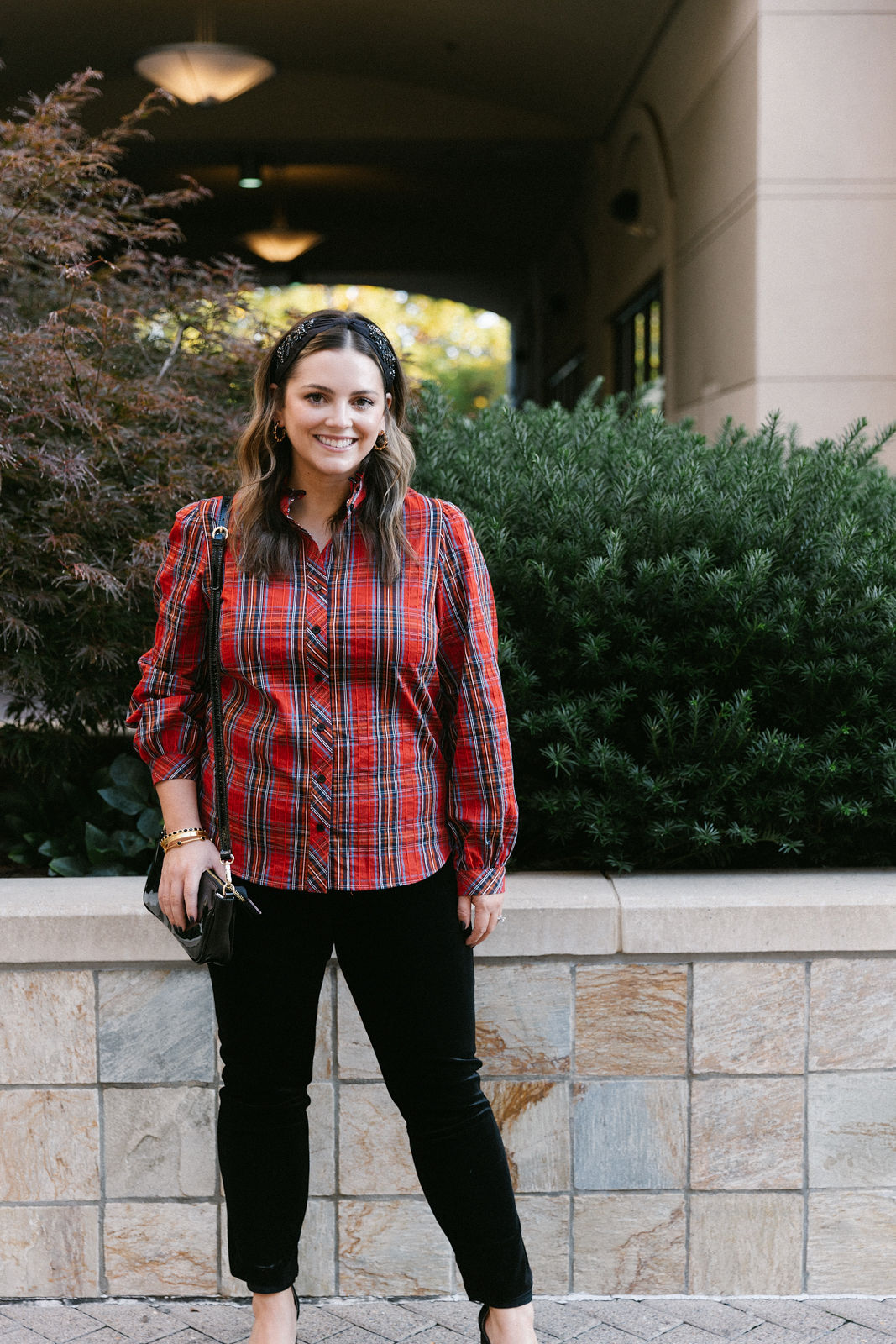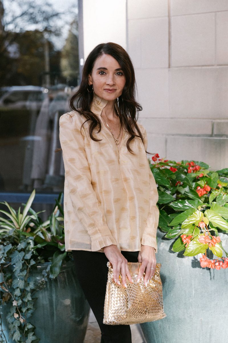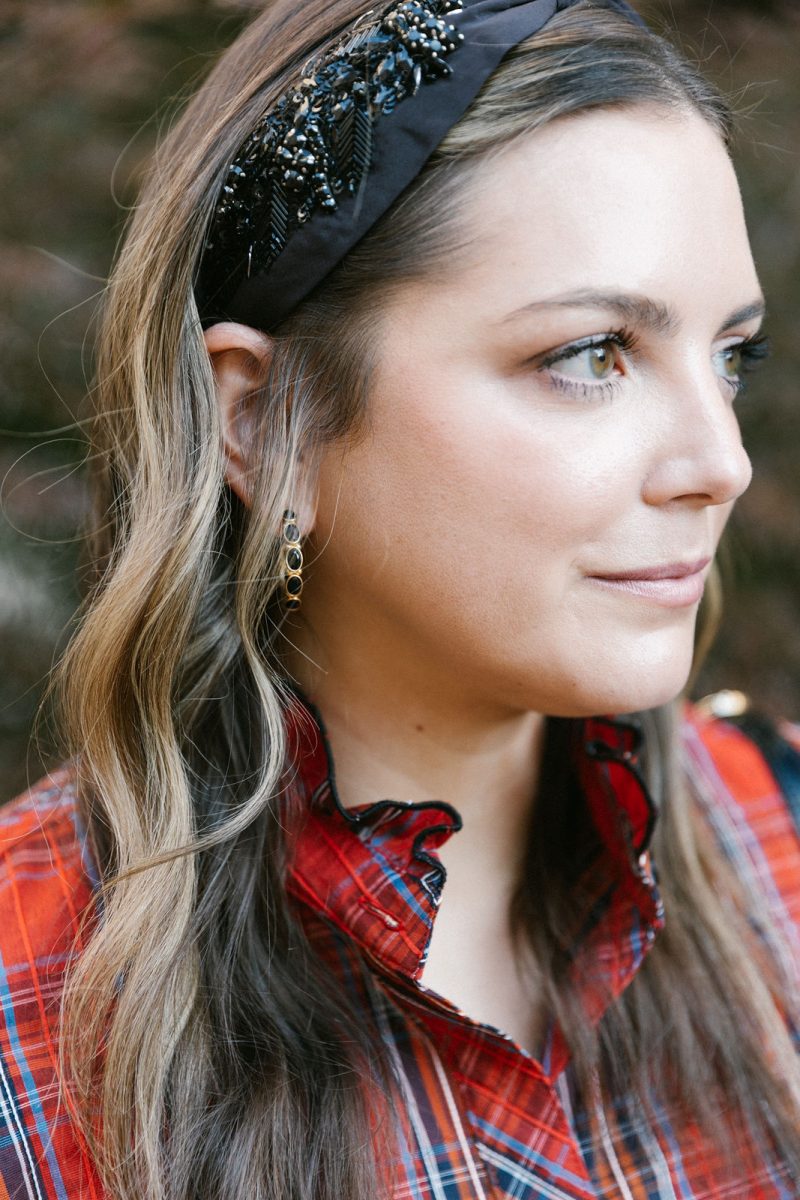 Katie is wearing a Finley blouse and Gretchen Scott pants with Julie Vos jewelry, a Namjosh headband and a Frances Valentine bag